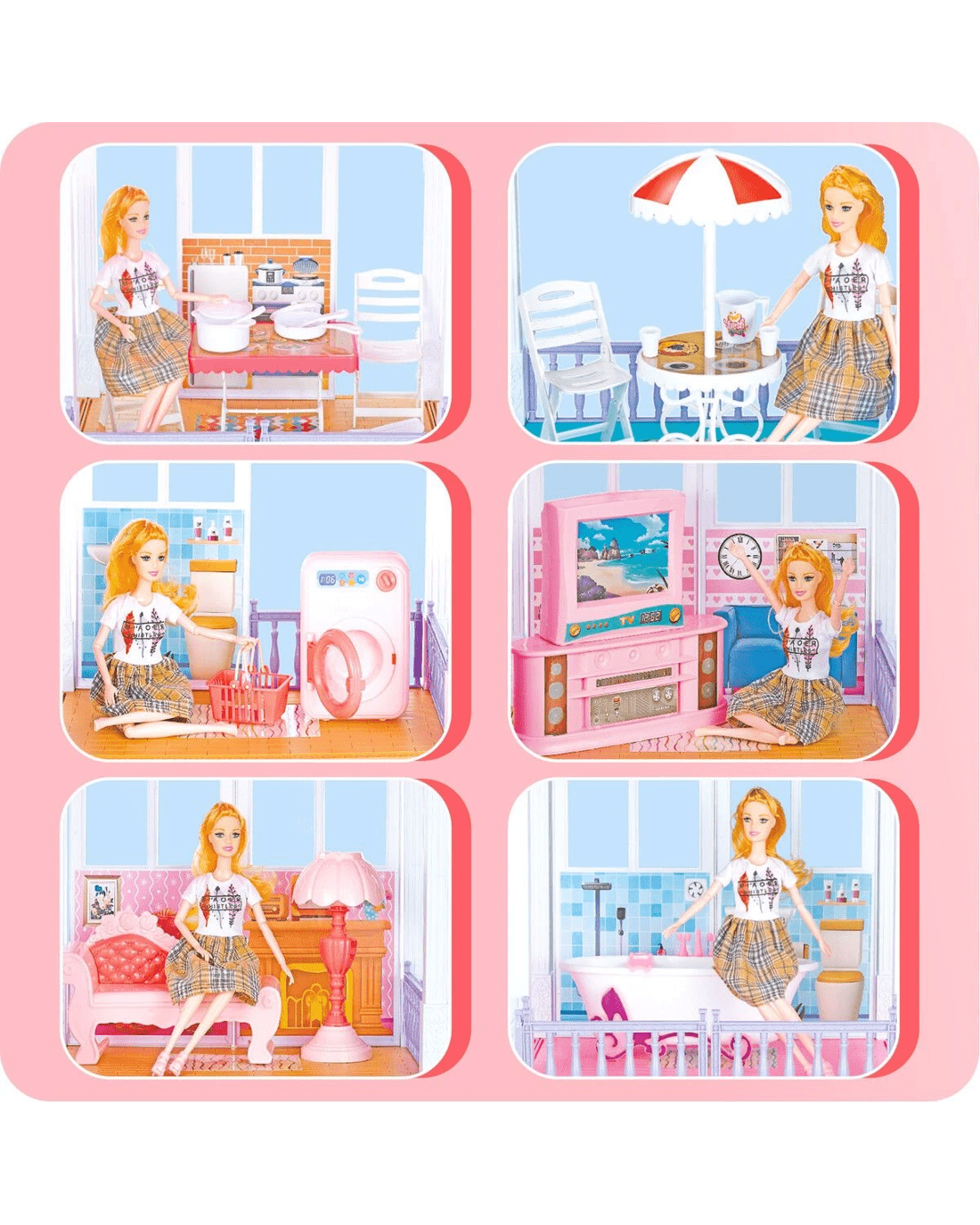- Endless Exploration: Featuring four stories and 8 detailed rooms, kids can enjoy hours of imaginative play, from relaxing in a cosy bedroom to sliding into the pool from the sunny balcony.