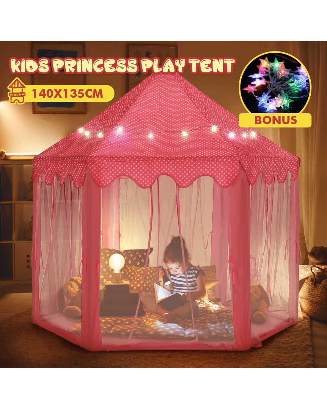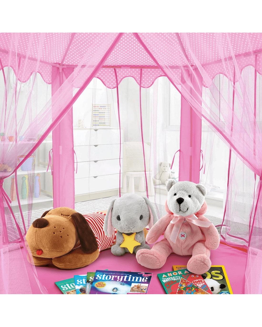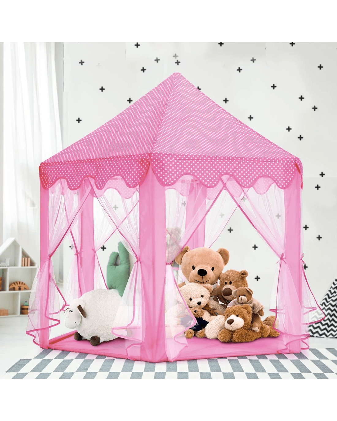 Give your little princess a magical and safe fairy zone to play and rest with the Kids Princess Castle Play Tent Play House. The kids play tent is made of high quality polyester and fabric, ensuring it is durable, comfortable and soft for toddlers to use. The kids' playhouse comes with an interesting hexagonal shape for maximum stability and safety. The kids' tent also includes multiple screens to offer more protection for your princess away from mosquitoes. Easy to assemble and clean, this DIY princess tent is beneficial to parent-children interaction and hand-eye coordination. The playhouse for kids has a wide range of applications, such as in a living room, bedroom, backyard and park.
