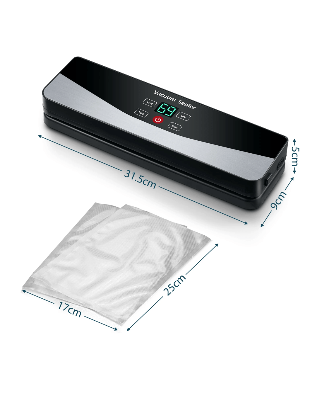 Keep dry or wet food fresher for longer and cut down on waste with this multifunctional vacuum sealer fresh meat food saver packaging machine. Its powerful suction system ensures rapid, airtight sealing to lock in freshness, preserve flavour, and slow bacterial growth. Plus, an integrated ultraviolet sterilisation function adds an extra layer of protection, helping prevent mould, germs, and other contaminants for safer food storage. Designed for automatic and manual operation, this vacuum sealing machine features a clear LED display, intuitive touch controls, and four sealing modes for optimal preservation of meats, produce, snacks, and more. Besides, a built-in 26 cm stainless steel cutter allows you to customise bag sizes with precision, while the secure handle-locking system ensures safe and stable use. Better still, the BPA-free, removable water tank is dishwasher-safe, making cleanup effortless and maintenance hassle-free. Compact and lightweight, this food sealer machine fits neatly on any kitchen setup and travels easily for use wherever you need it.