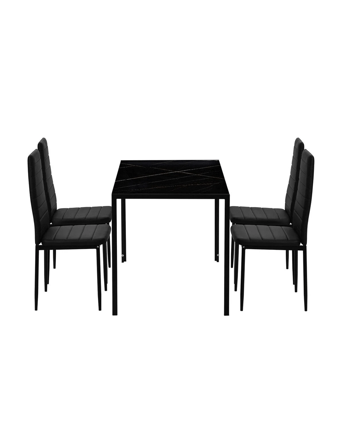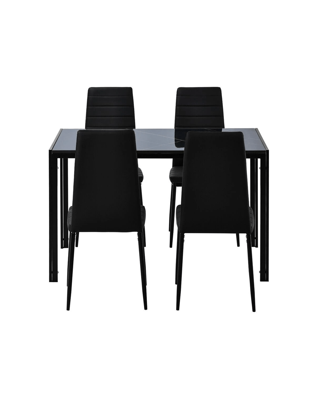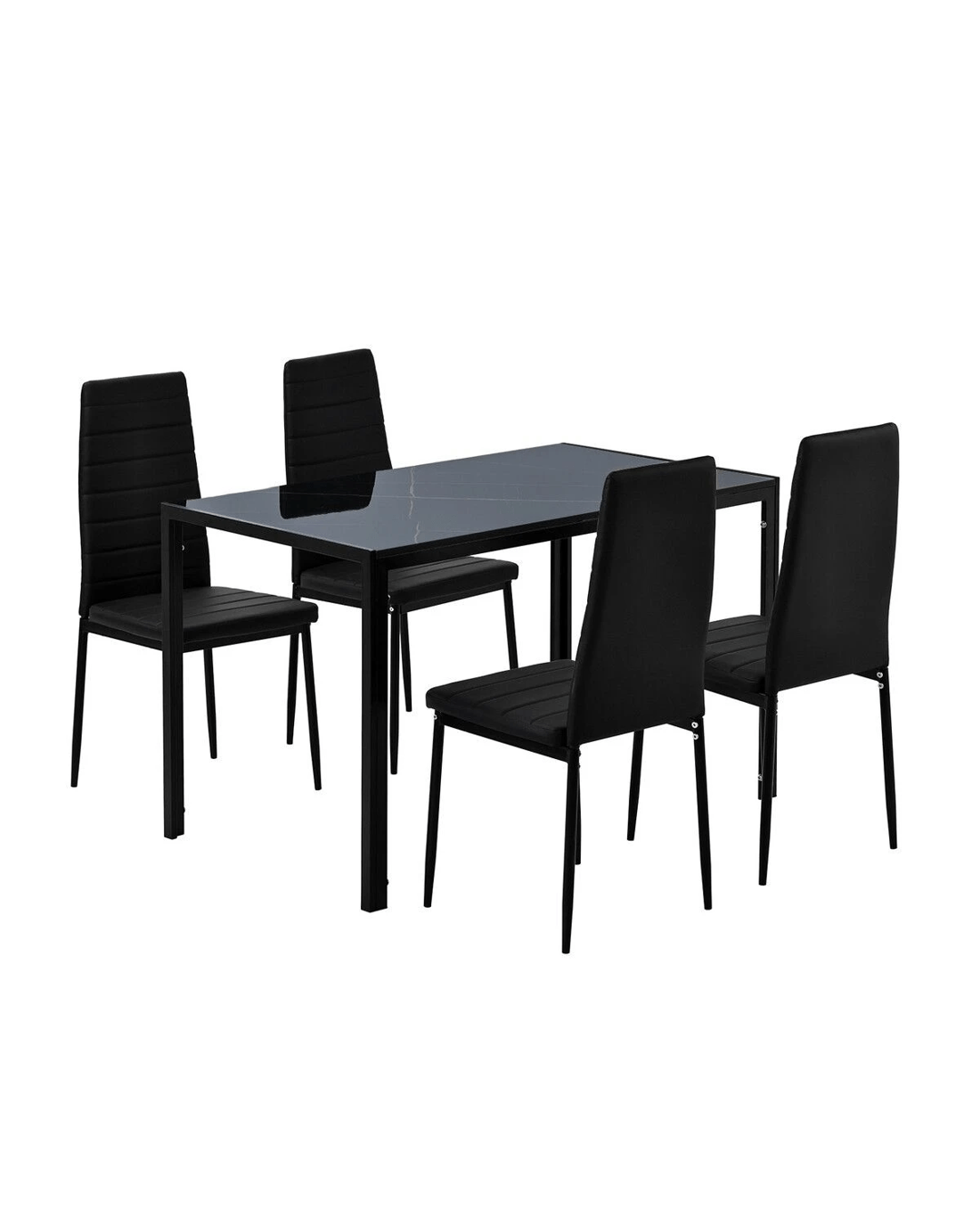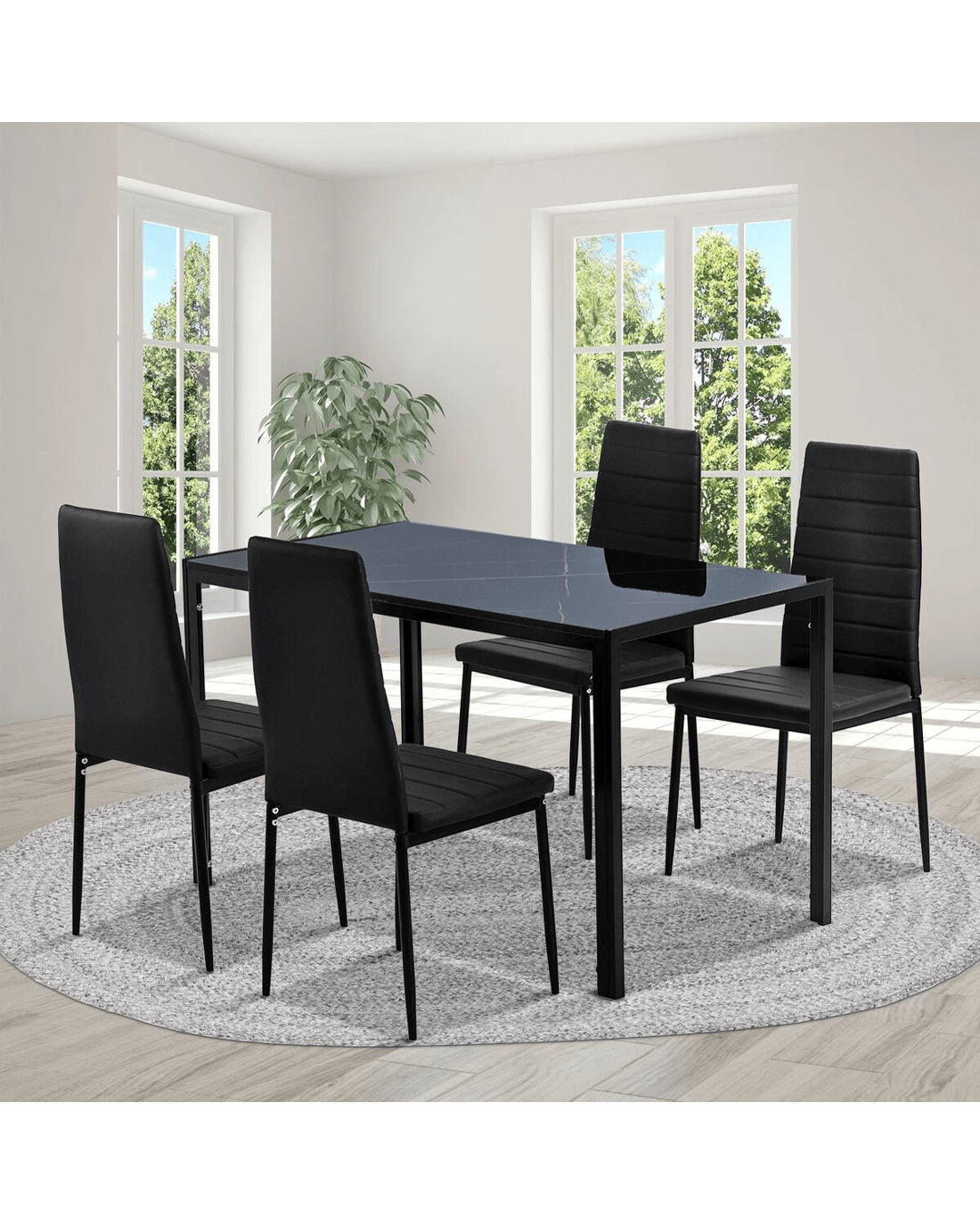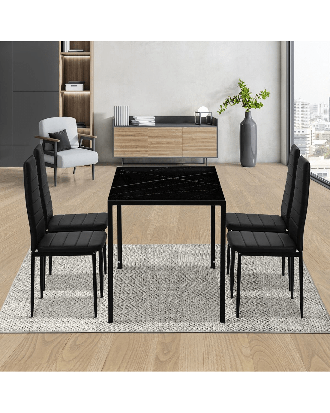 Upgrade your dining experience with our exquisite five-piece table set, featuring a high-gloss imitation marble surface that adds a touch of modern elegance to any home. The robust metal construction guarantees lasting durability and strong weight support. Sink into comfort with chairs adorned with soft cushions and durable leather, complemented by an ergonomically designed high backrest for enhanced support. Compact and perfect for a family of four, this space-saving set allows chairs to be neatly tucked under the table after meals. Versatile for both home and commercial use, it offers a spacious dining area. Effortless assembly, thanks to detailed instructions and included hardware, adds to the appeal. Additionally, the waterproof marble tabletop and leather surface ensure easy cleaning, making maintenance a breeze. Transform your dining space with style, comfort, and convenience.