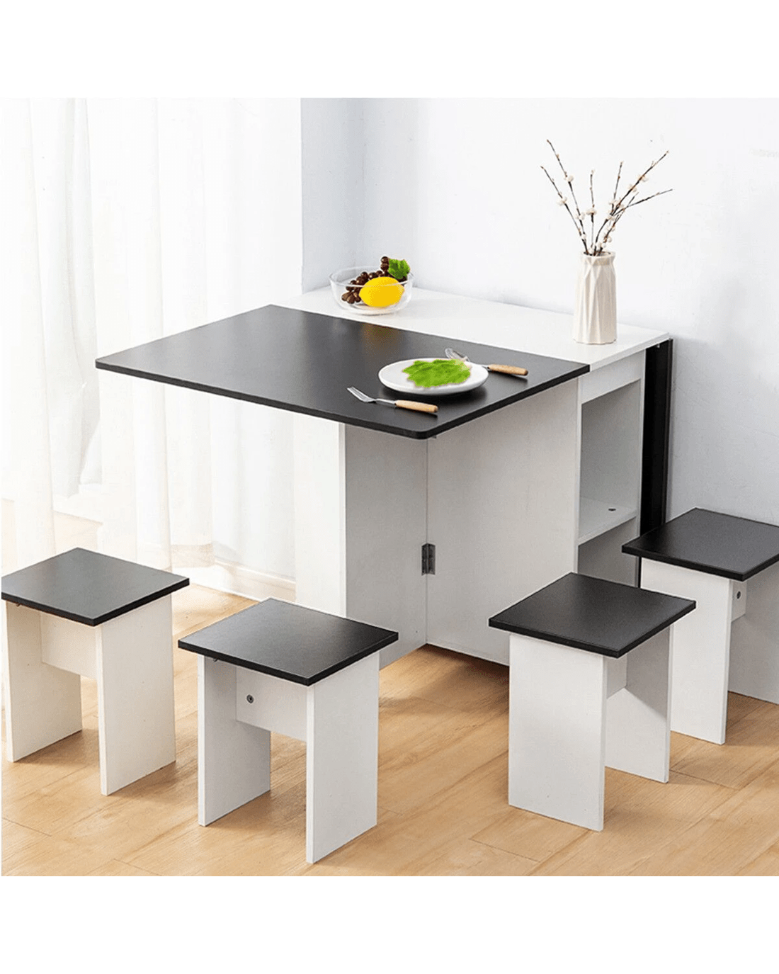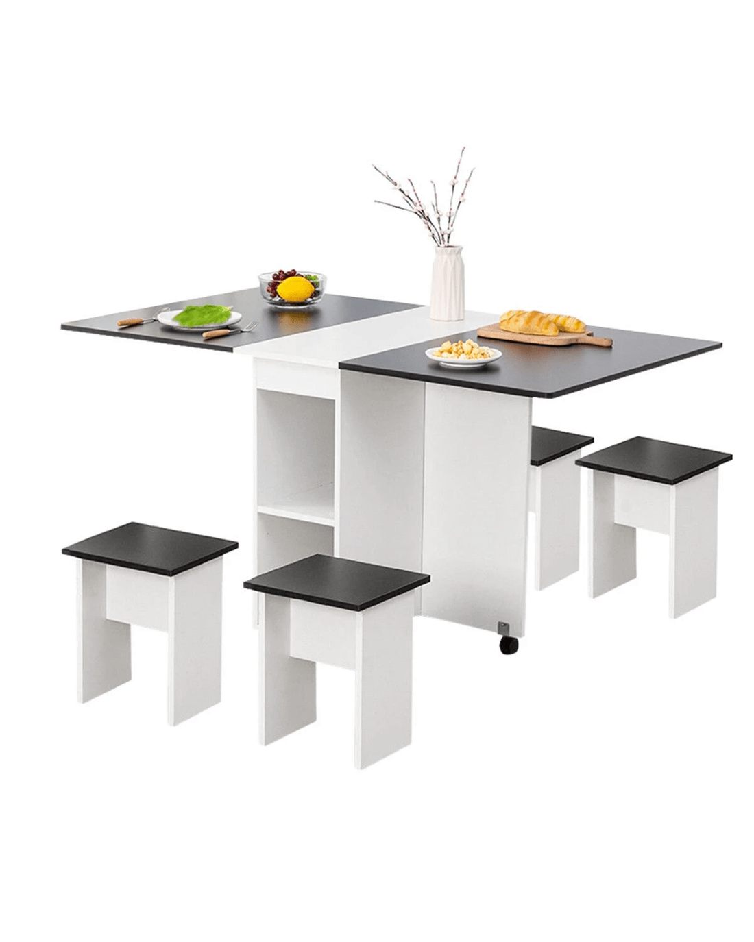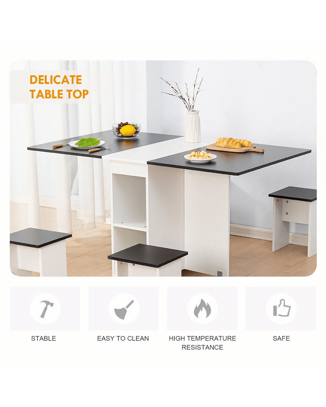 Made of eco-friendly particle board, this dining table set comes with a new foldable design, which helps you to save space and makes your dining room neater. With three modes of double folding, sided folding, and non-folding, this table set is suitable for different purposes, such as dining table, home office desk, and sofa table. Moreover, equipped with non-slip bearing wheels which rotate 360°, the folding table is easy to move and stop. With four chairs, you can use this table set to have a romantic meal or daily meal with families or friends. In addition, it can also be served as a paly table or study table for kids when spreading out. Plus, this foldable dining table set is easy to clean.