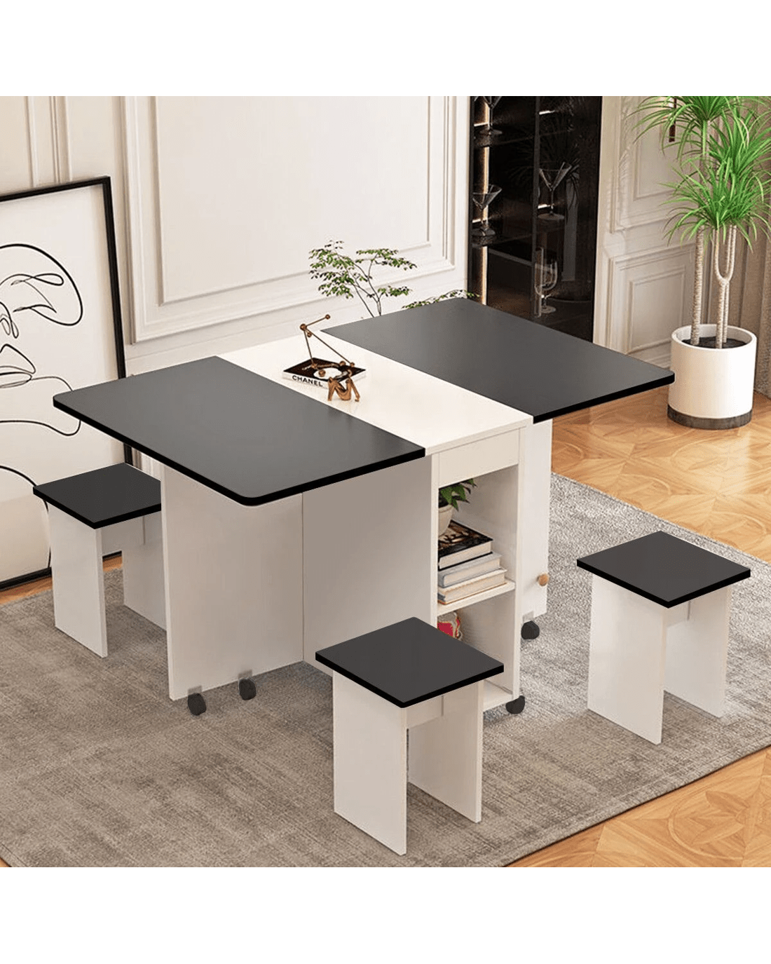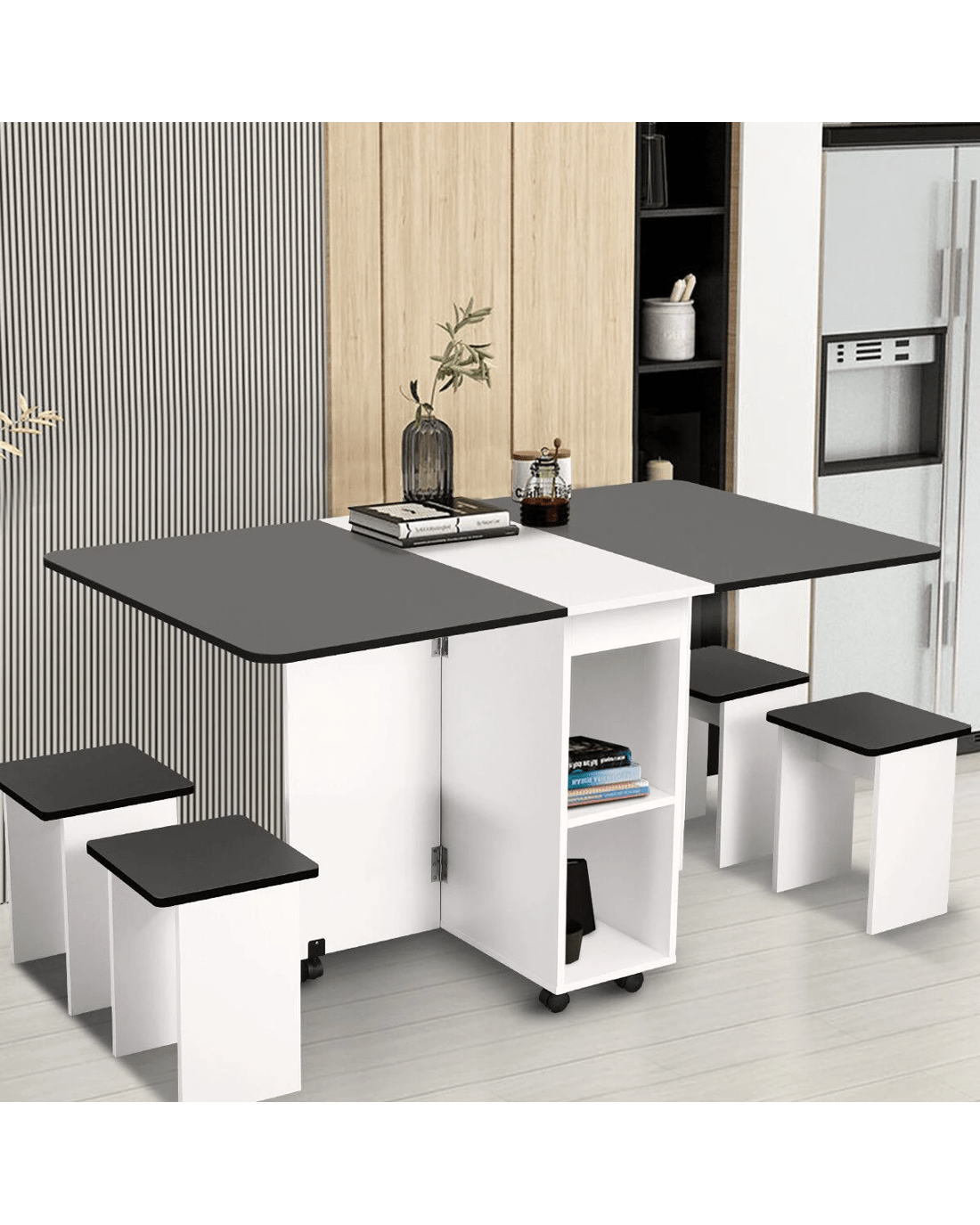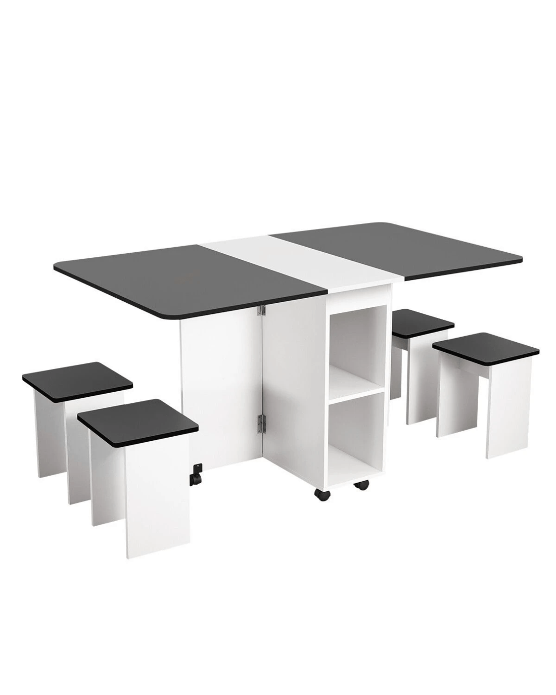 Made of eco-friendly particle board, this dining table set comes with a new foldable design, which helps you to save space and makes your dining room neater. With three modes of double folding, sided folding, and non-folding, this table set is suitable for different purposes, such as dining table, home office desk, and sofa table. Moreover, equipped with non-slip bearing wheels which rotate 360°, the folding table is easy to move and stop. With four chairs, you can use this table set to have a romantic meal or daily meal with families or friends. In addition, it can also be served as a paly table or study table for kids when spreading out. Plus, this foldable dining table set is easy to clean.