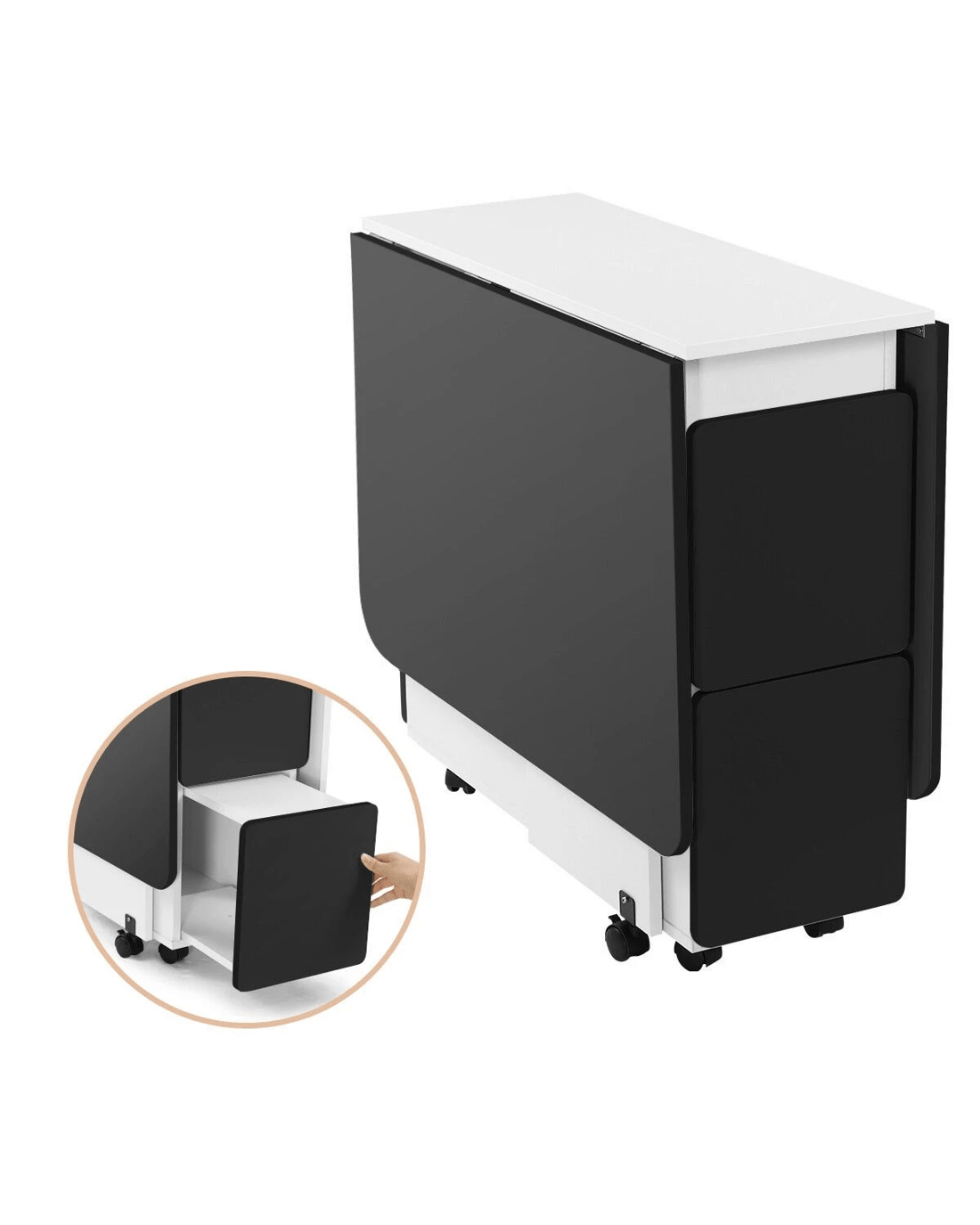 - The table has non-slip bearing wheels which rotate 360° for extra convenience