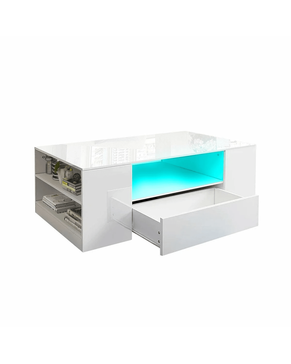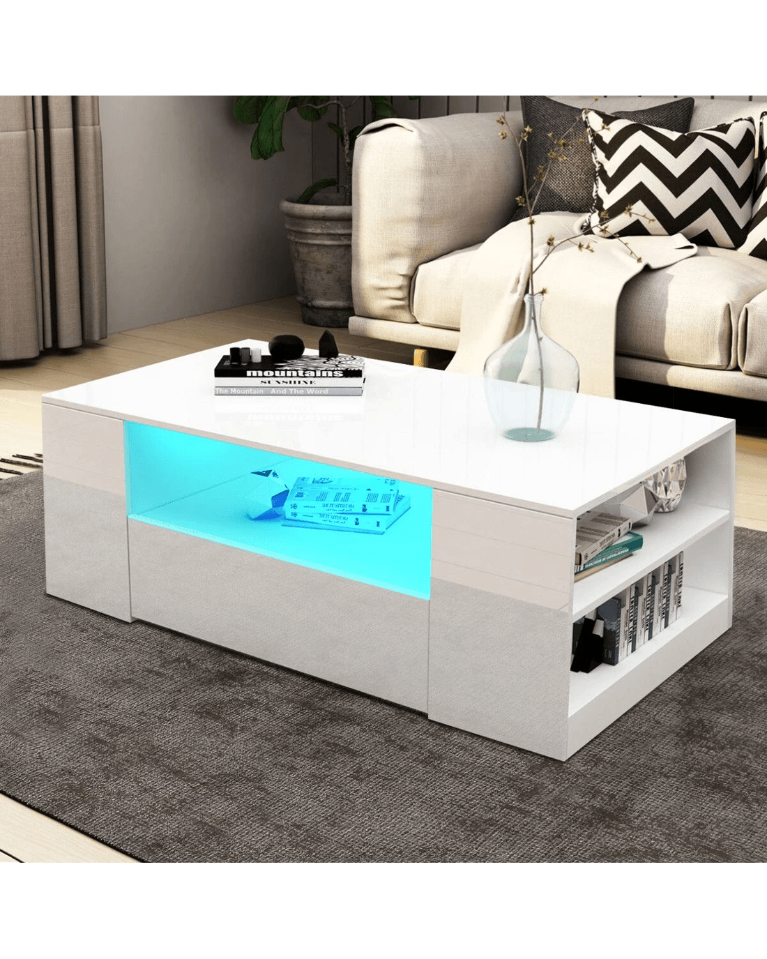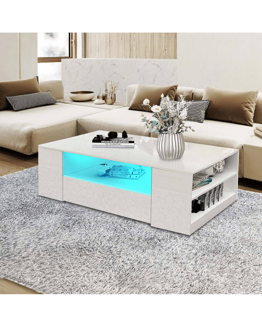 This Modern White High Gloss Coffee Table Living Room Storage Furniture is a convenient spot for you to rest drinks or kick up your feet when lounging. Coming in high-quality particleboard construction with a white high gloss front and matte finished parts, this unit measuring 95x55x37cm is rugged and durable to last long. Better still, it integrates elegance with modernity to upgrade your living area as well as inspires easy maintenance during daily life. The rectangle coffee table is also equipped with two drawers and multiple storage shelves to accommodate your items and save space. Furthermore, this model is built with a LED light strip for 16 colours which promises low power consumption and stable performance. ;