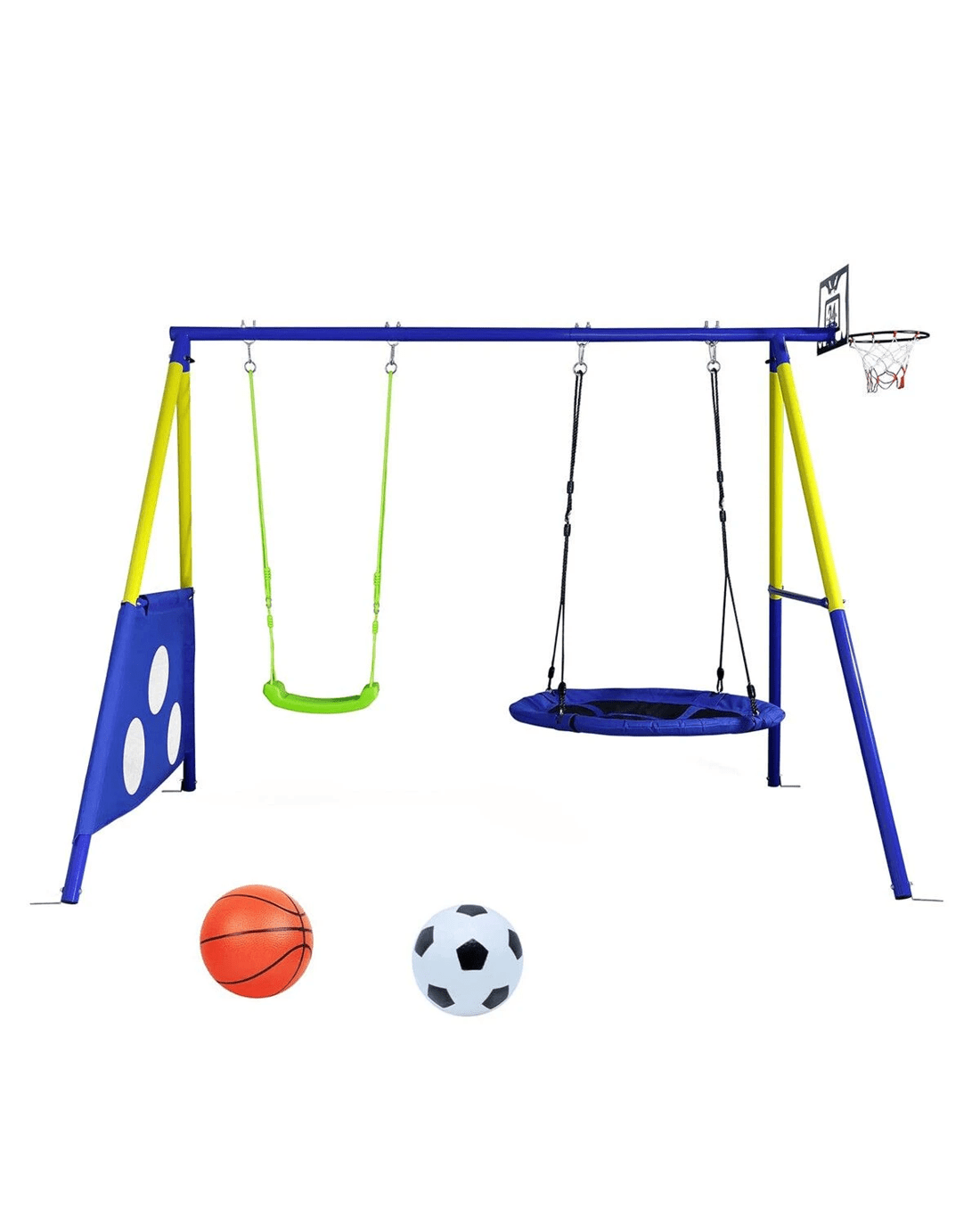 Build the perfect backyard playground without compromising on safety with our 4-in-1 Outdoor Swing Set. The robust, all-metal A-frame stand and sturdy ground stakes provide rock-solid stability and a high weight capacity for years of worry-free play. It combines a classic swing, a basketball hoop for slam dunks, a flying saucer seat for thrilling spins, and a pair of football gates for epic matches. In addition, the spacious, adjustable swing seat offers a comfortable ride that grows with your child, making it a lasting centrepiece in your garden. Assembly is simple and family-friendly, with clear instructions that turn setup into valuable bonding time. This children's swing set is the ultimate gift for birthdays or any special occasion, bringing endless laughter, physical activity, and cherished outdoor memories. Create your family's favourite hangout with this multifunctional outdoor play set.