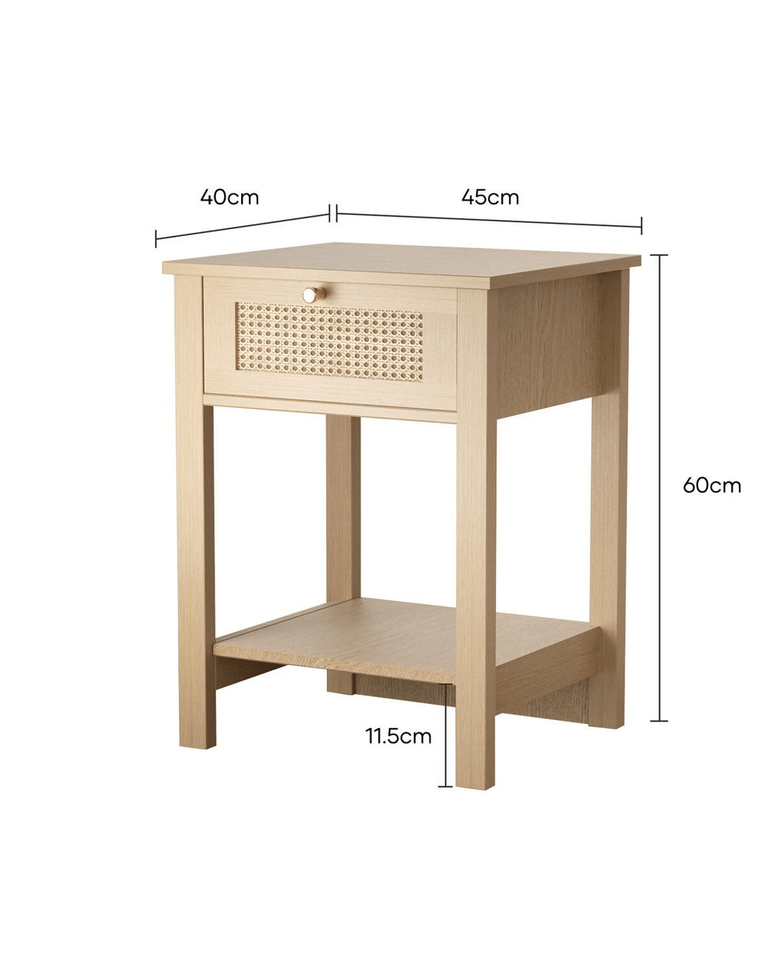 - Ample Storage Space: This nightstand features a deep drawer accented with rattan and open shelves, providing generous storage options. The spacious tabletop easily accommodates a lamp, remote controls, cups, magazines, and more—ideal for keeping your bedroom or living room tidy and organised.