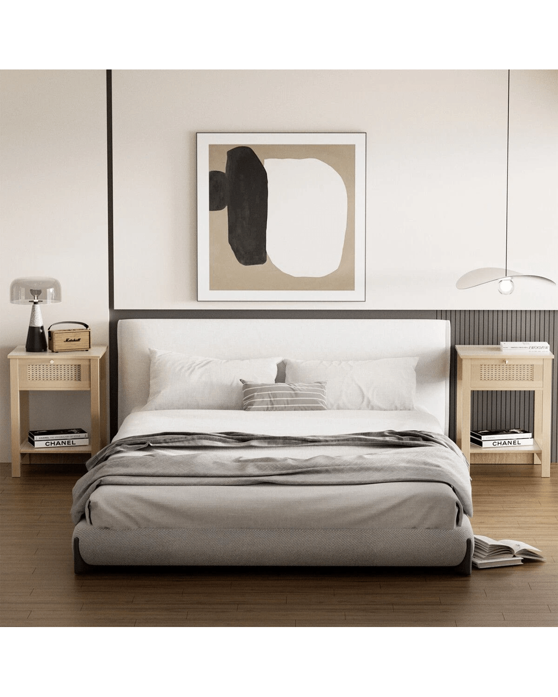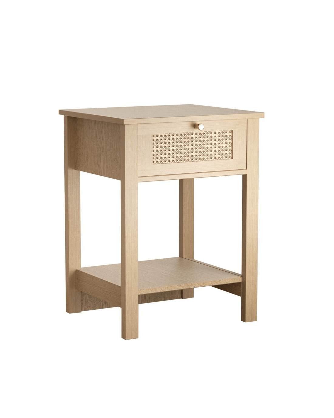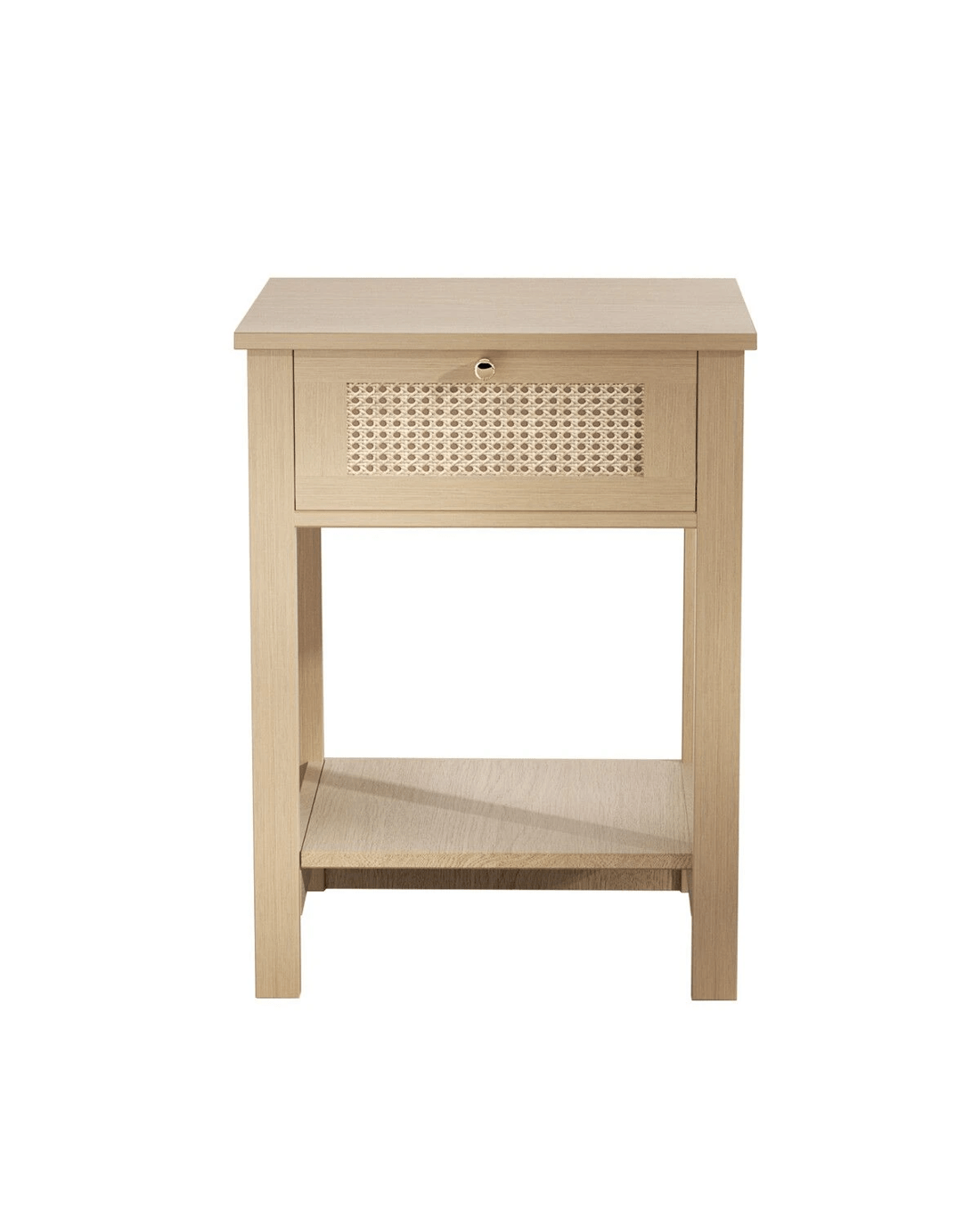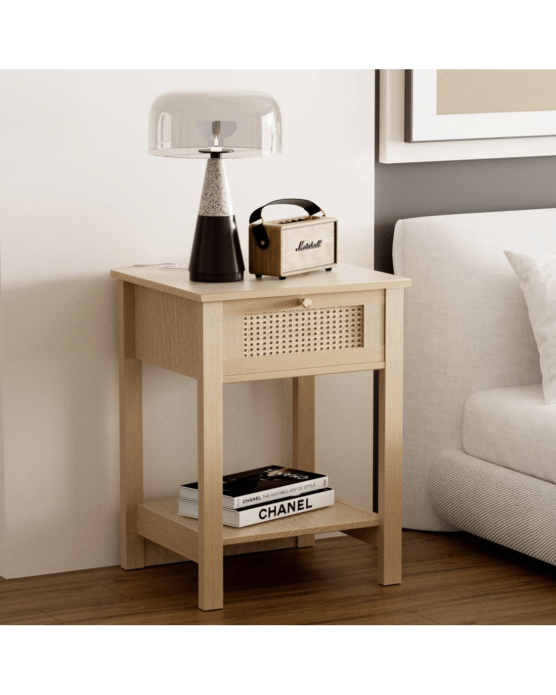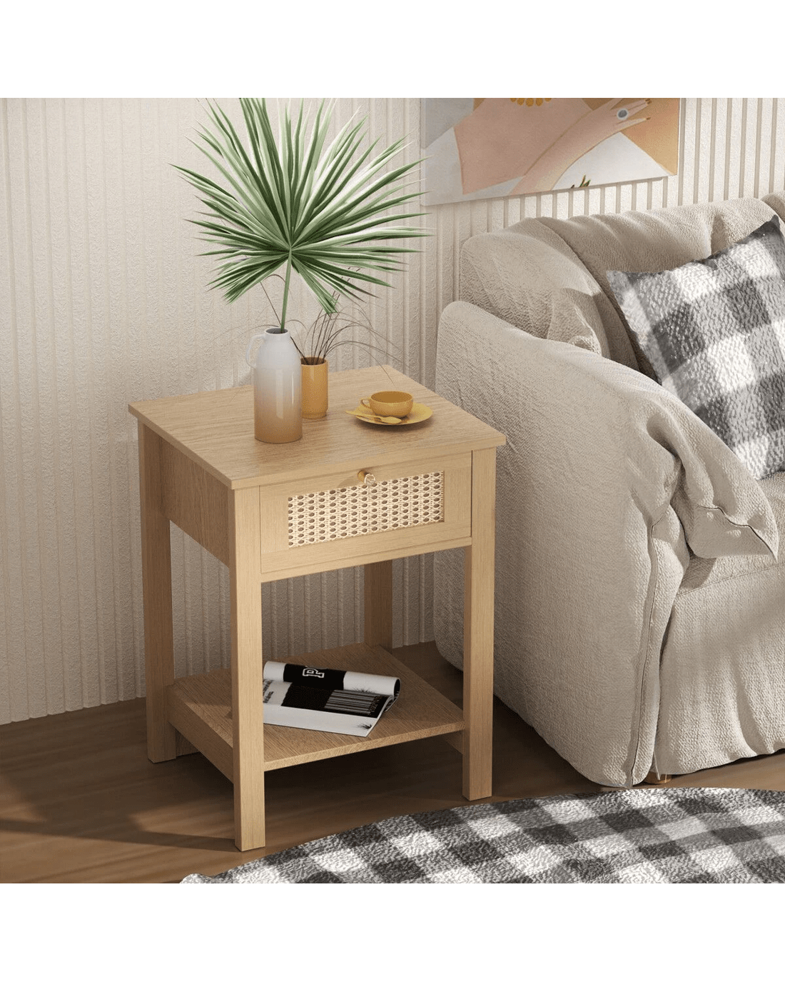 Add this modern bedside table to have a dreamier, minimalist bedroom. Crafted from solid wood and high-quality particle board, it features a clean-lined silhouette, a rattan-accented drawer, and straight block legs that blend effortlessly with modern and traditional decor. The smooth-gliding drawer provides concealed storage for books, remotes, and nighttime essentials, while the open shelf keeps everyday items like an alarm clock, tissue box, diffuser, or glasses case within easy reach. The tabletop is perfect for a small lamp or plant, adding a subtle decorative touch. Compact yet functional, this nightstand is a perfect fit for bedrooms or living rooms alike.