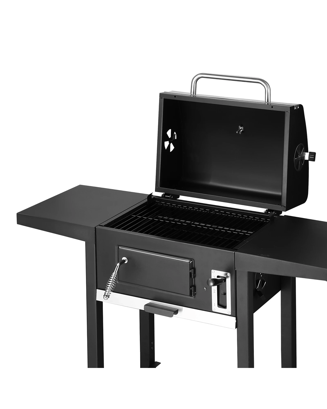 - Front door with a cool-touch handle makes stoking the fire pit with coal or charcoal easily during cooking.