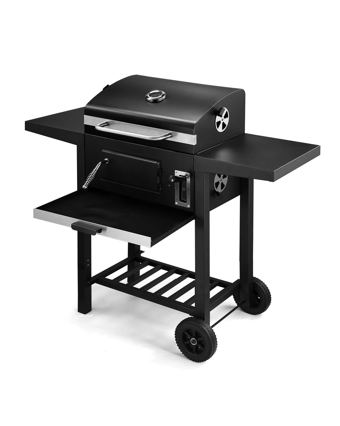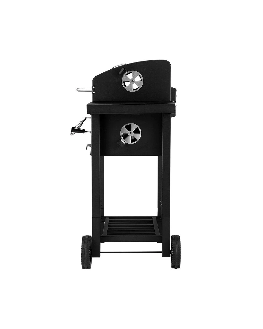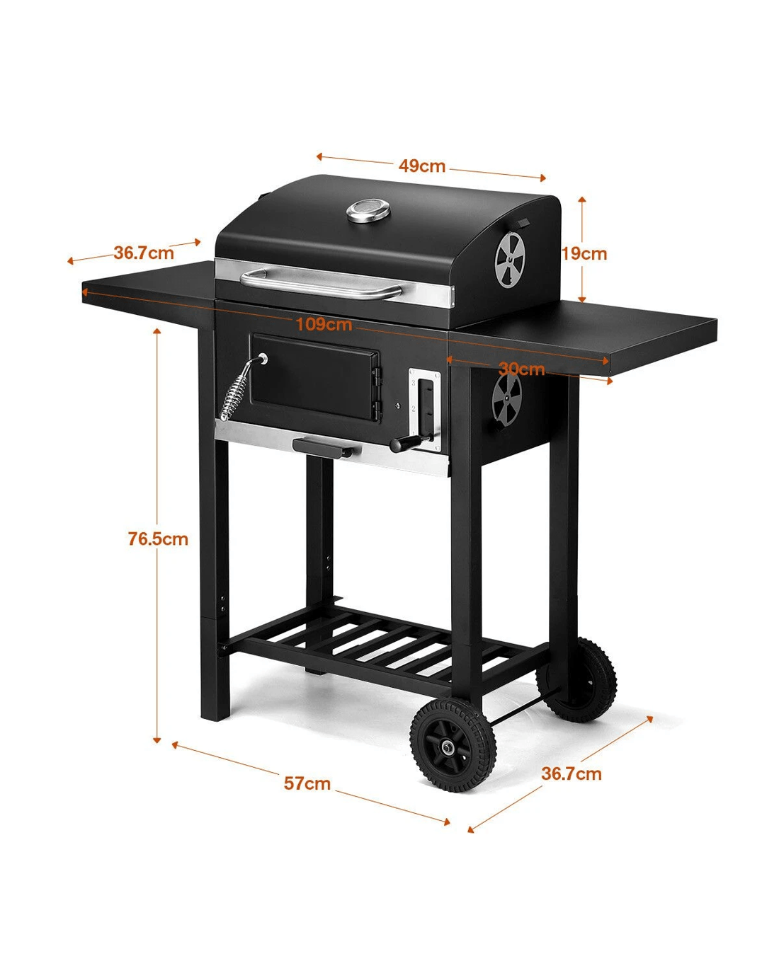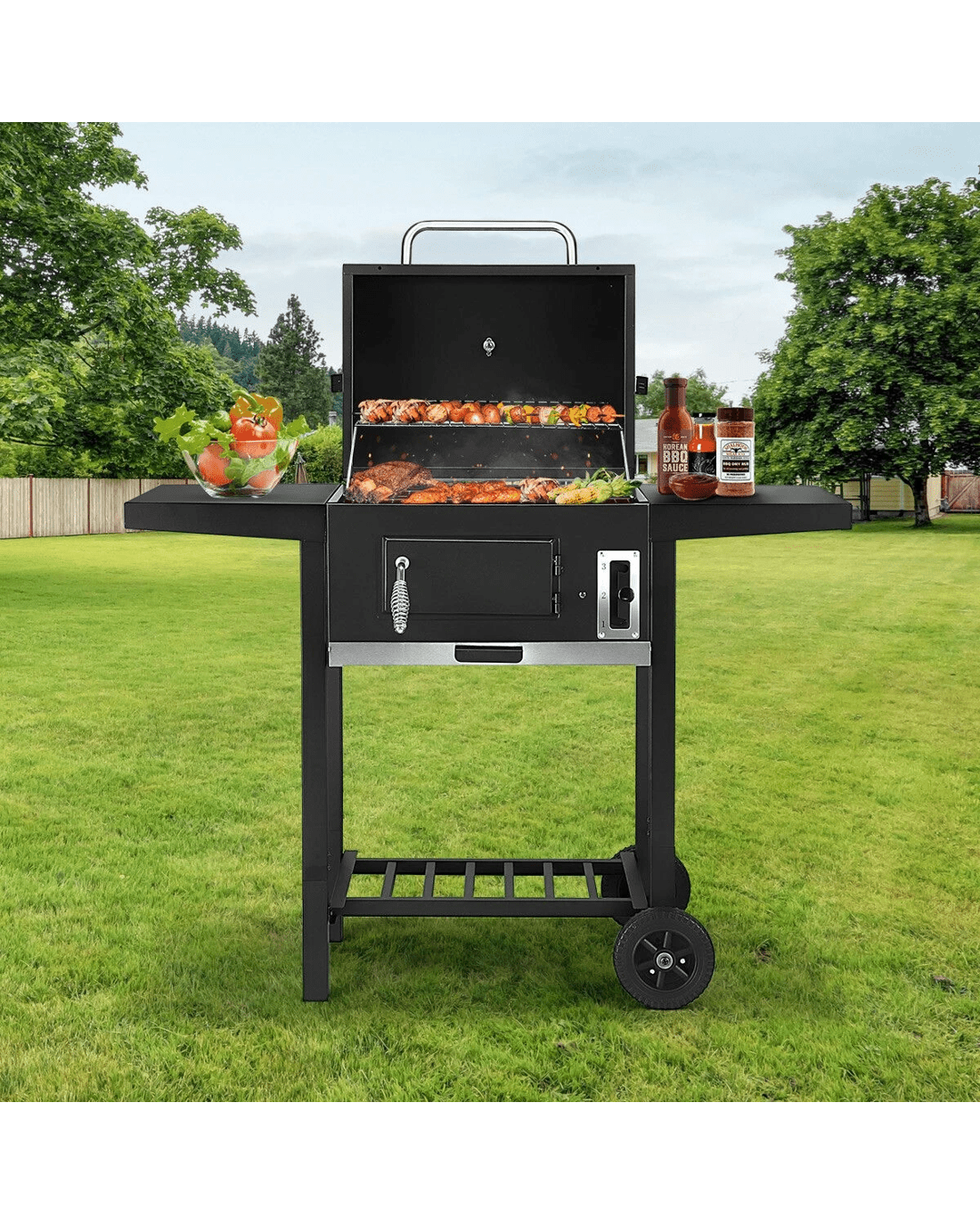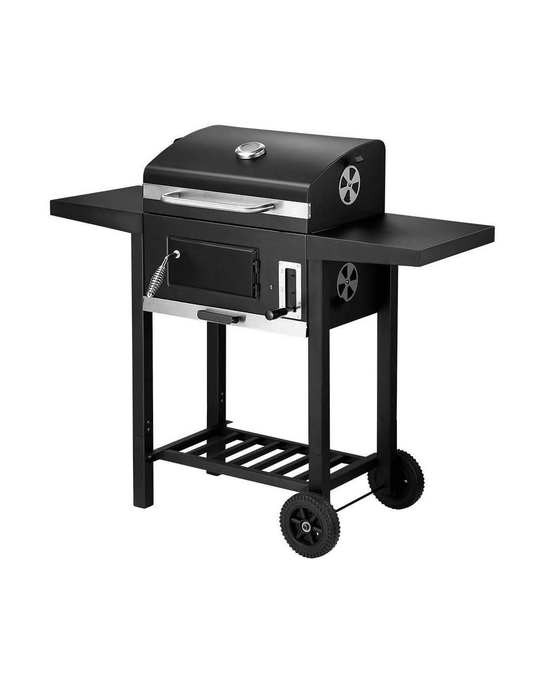 Cook savoury dishes for your family at outdoor gatherings with Charcoal BBQ Grill Trolley Portable Cooking Grill. This steel-constructed barbeque charcoal grill comes equipped with two spacious side shelves to place ingredients, condiments and kitchenware. Safely and easily stoke the outdoor grill with coal or charcoal during cooking by the front door with a cool-touch handle. Designed with a thermometer on the top lid, the best grill indicates the burning temperature. Also, an easy-lift charcoal pan adjustment system is for heat control and cooking flexibility. Four vents maximally enhance air circulation to support adequate charcoal burning. With two wheels equipped at the bottom, the grill trolley is easy to transport. Better still, a pull-out tray catches ashes for easy cleanup.