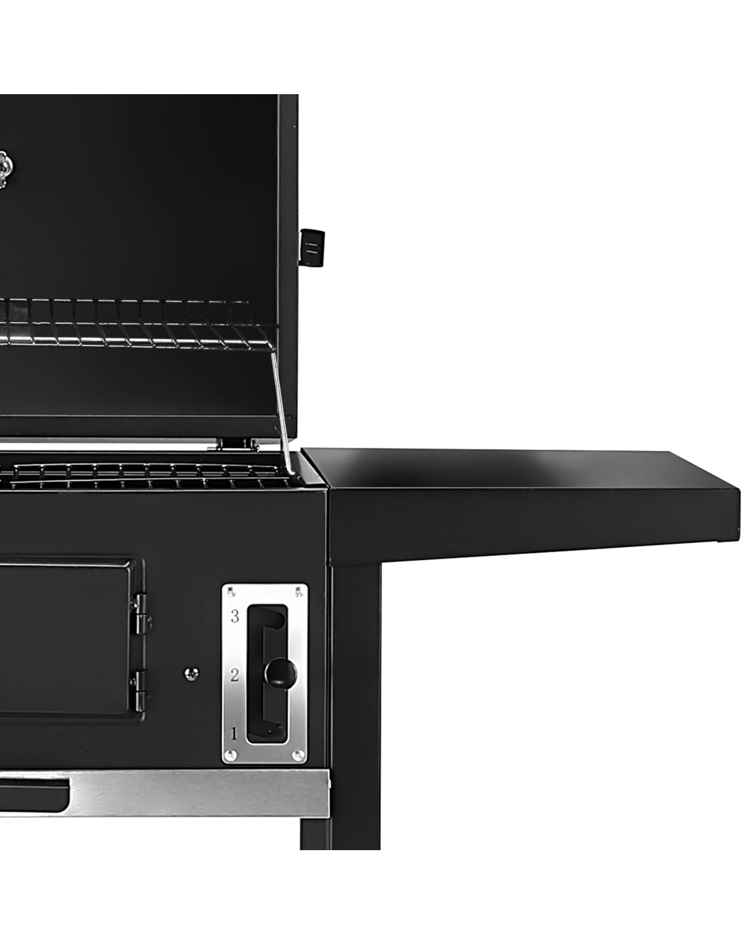 - Easy-lift charcoal pan adjustment system for heat control and cooking flexibility