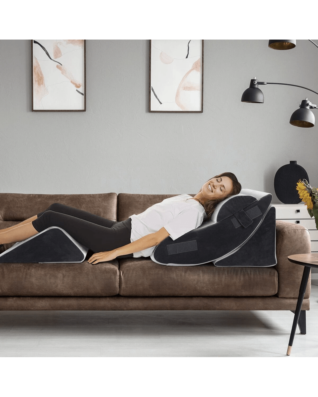 Using a wedge pillow can offer numerous benefits, including reducing acid reflux, snoring, and symptoms of obstructive sleep apnea. This multifunctional cushion set comes equipped with an adjustable headrest that can be used for various purposes, such as sleeping, reading, and leg elevation. Made from top-quality 40d memory foam in a triangular shape, the pillow moulds to your unique contours and enables self-adjustment throughout the night. Additionally, the velvet pillow cover boasts a zip-off design and is machine washable. The bed wedge is available in a large size for your comfort needs and is designed to conform to your body shape, thus providing you with unsurpassed comfort and orthopaedic support. Thus, our versatile design and top-quality construction make it a must-have for those looking to elevate their sleeping experience.