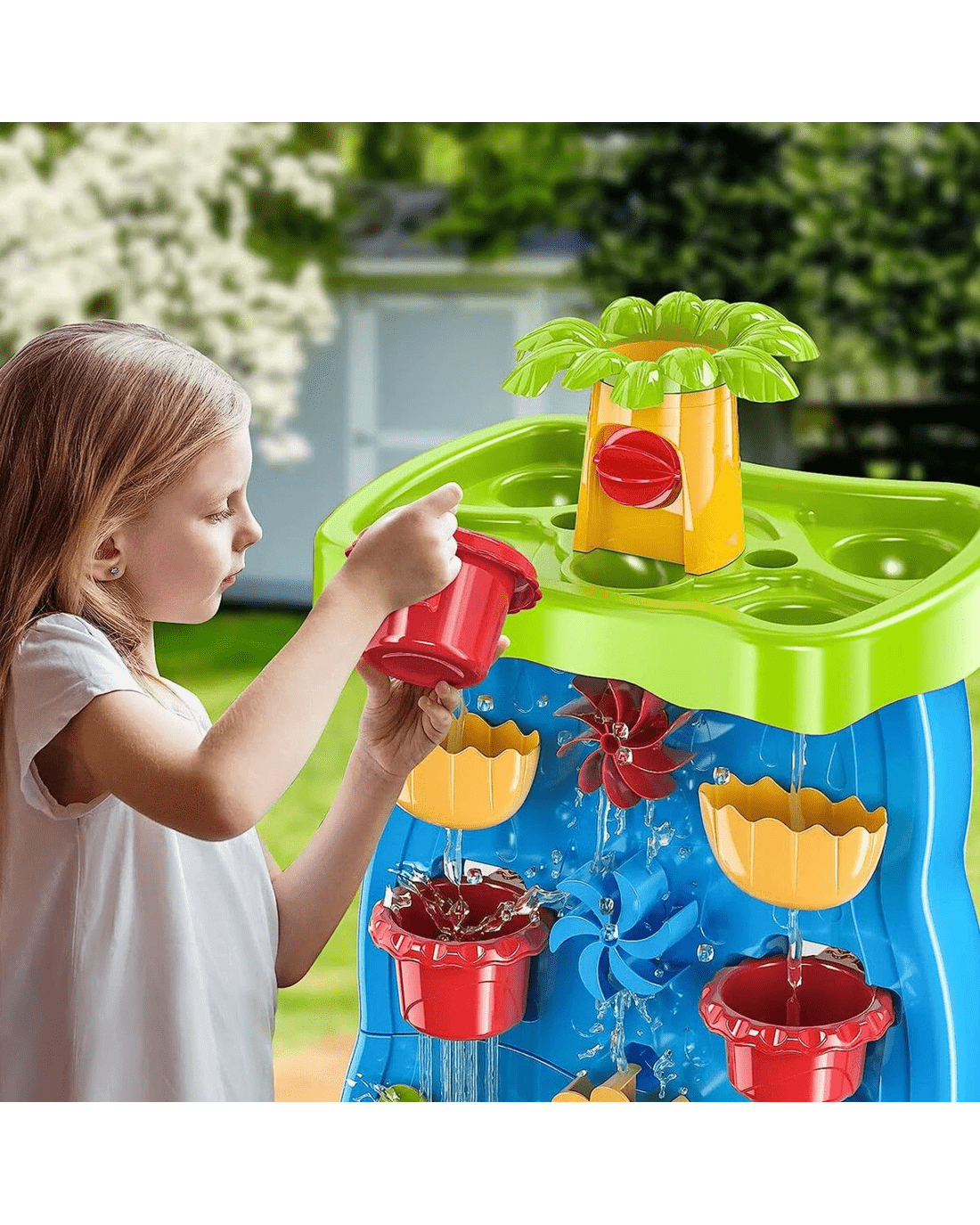 Our waterfall wall water and sand table supports independent play and fosters fine motor skills for your younger children. Featuring an eco-friendly and strong plastic structure, this water play table is non-toxic, BPA-free, and odour-free for maximum safety. It comes with various water toys and accessories, such as water wheels, funnels, spoons, a watering pot, a bucket, animal moulds, shovels, and so on. Moreover, this double-sided water wall can enhance your kid’s cognition and imagination while encouraging his cooperation and competition with partners. Suitable for indoor and outdoor use, the versatile water playset allows for sand and water play. Further, its easy-to-move design makes it perfect for taking it to the beach, backyard, garden, or swimming pool.