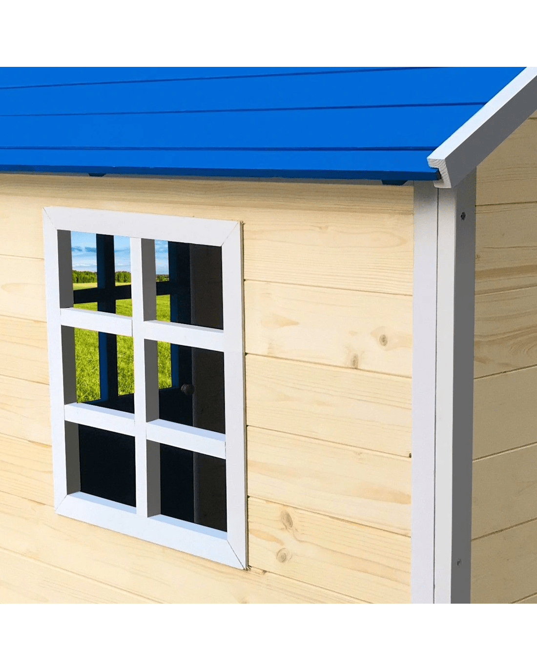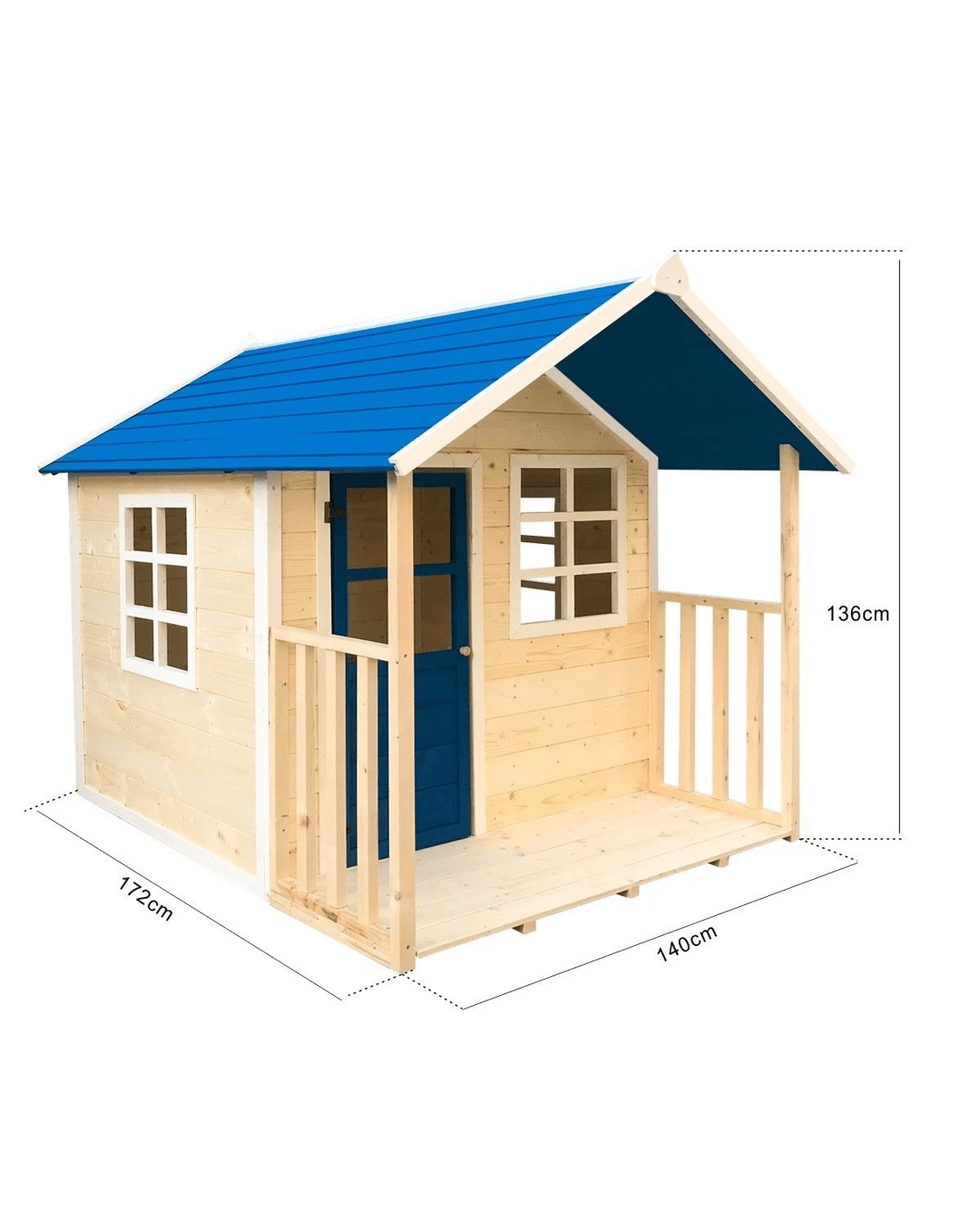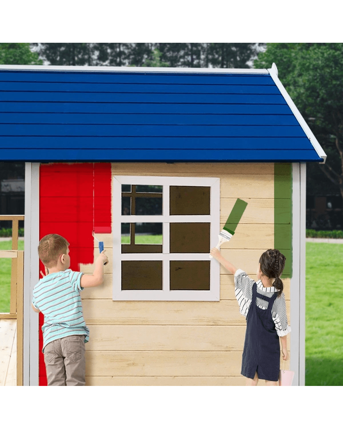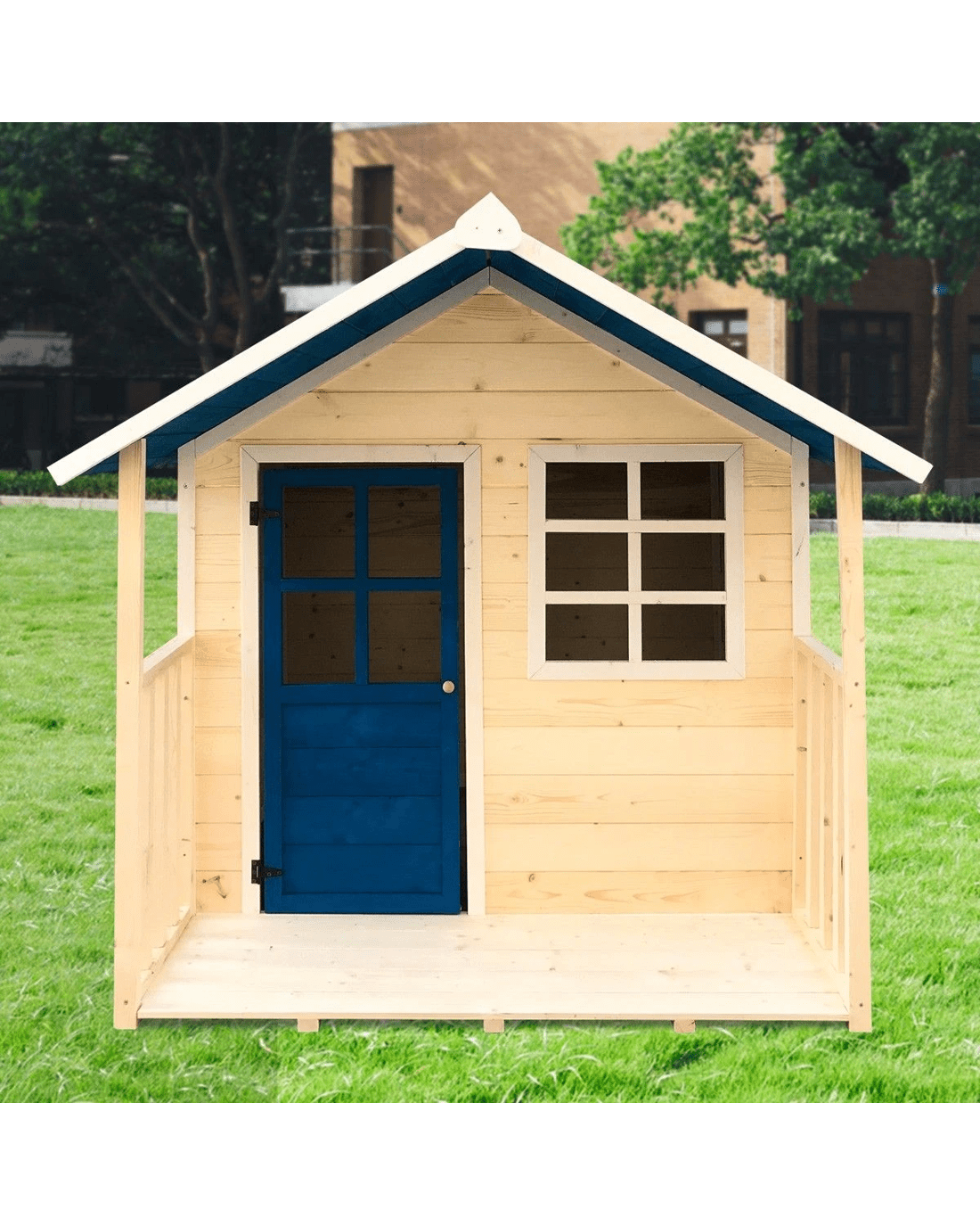 This new design of wooden cubby house offers a unique design for an appealing appearance. The treated wood construction out of fir wood, finished with eco-friendly and waterproof paint, is durable and weather-resistant, suitable for outdoor use. The cubby house is equipped with front and side windows that allow ample natural light to freely travel through. The swinging door in bright blue, the same colour as the roof, is designed for easy access. Your children's favourite game will be on excitingly once with this wonderful cubby house in the backyard, as the house is the perfect hiding place for kids. The wooden house requires only easy assembly and little maintenance.