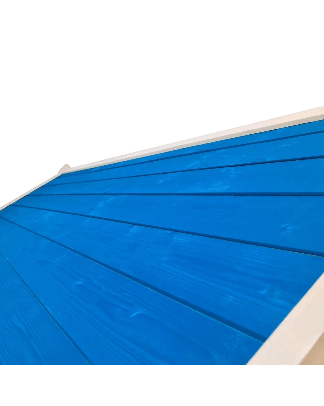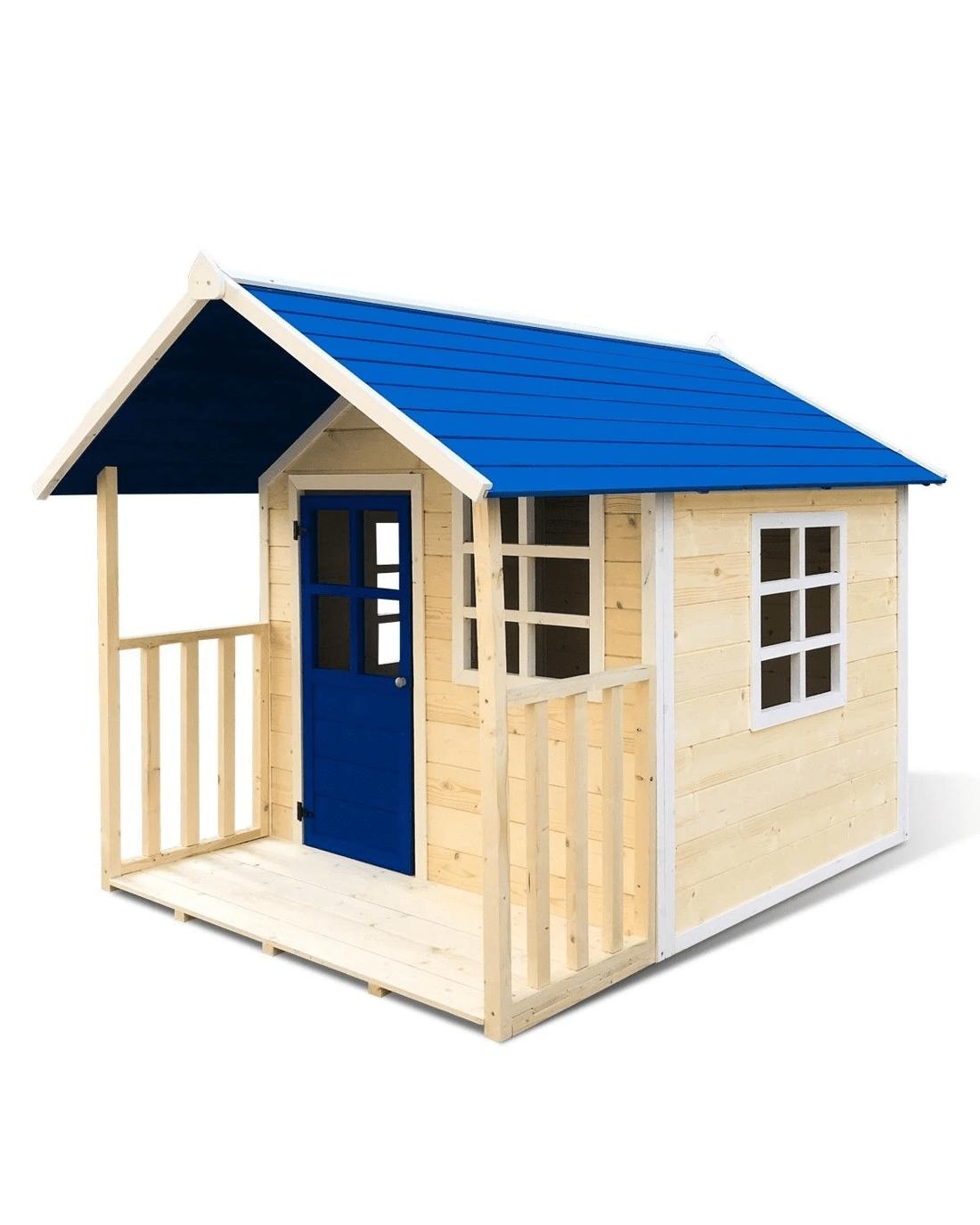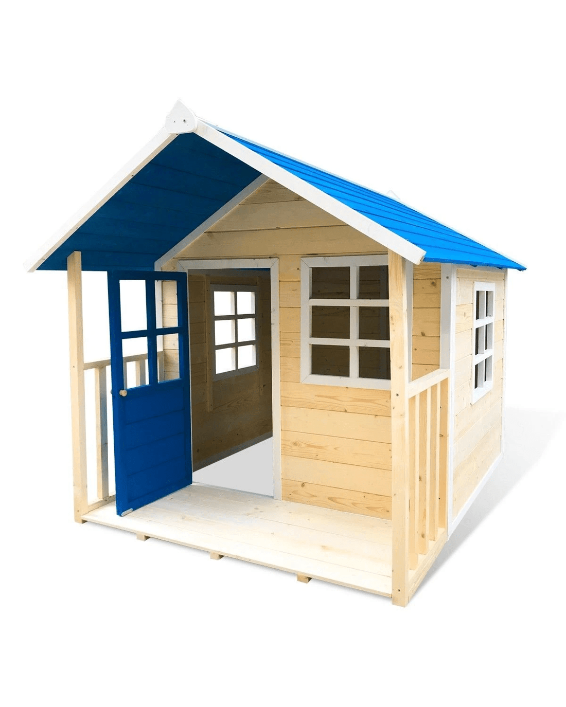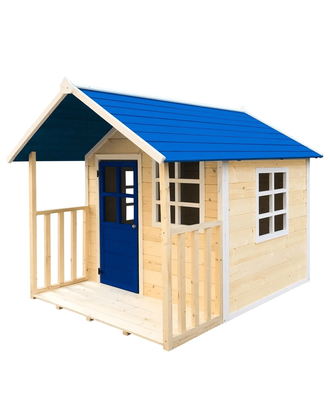 This new design of wooden cubby house offers a unique design for an appealing appearance. The treated wood construction out of fir wood, finished with eco-friendly and waterproof paint, is durable and weather-resistant, suitable for outdoor use. The cubby house is equipped with front and side windows that allow ample natural light to freely travel through. The swinging door in bright blue, the same colour as the roof, is designed for easy access. Your children's favourite game will be on excitingly once with this wonderful cubby house in the backyard, as the house is the perfect hiding place for kids. The wooden house requires only easy assembly and little maintenance.