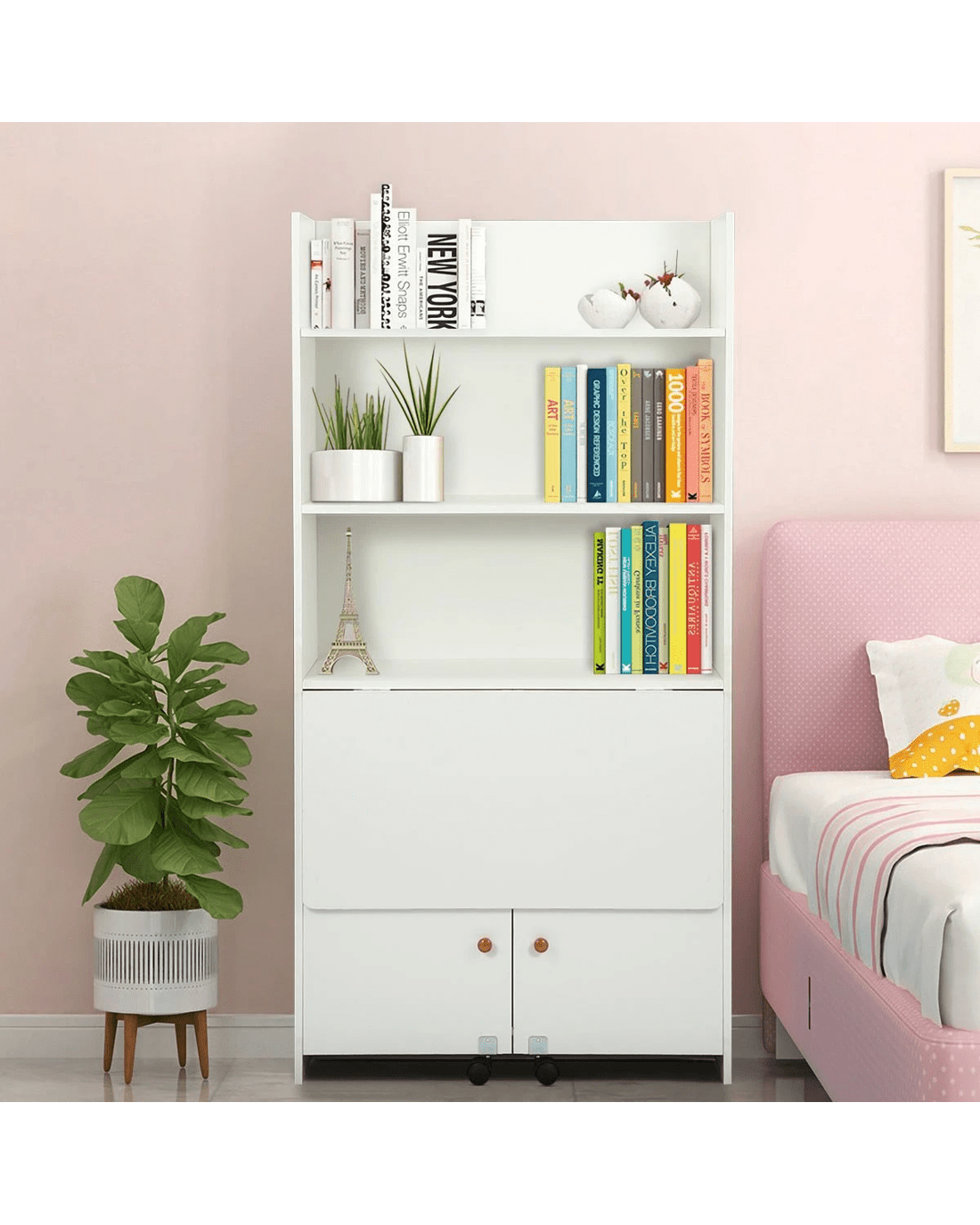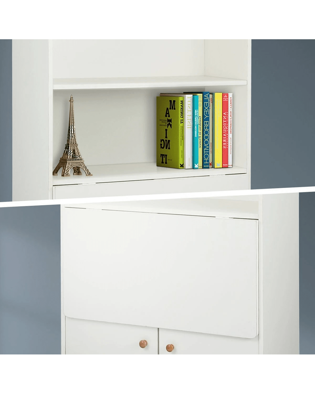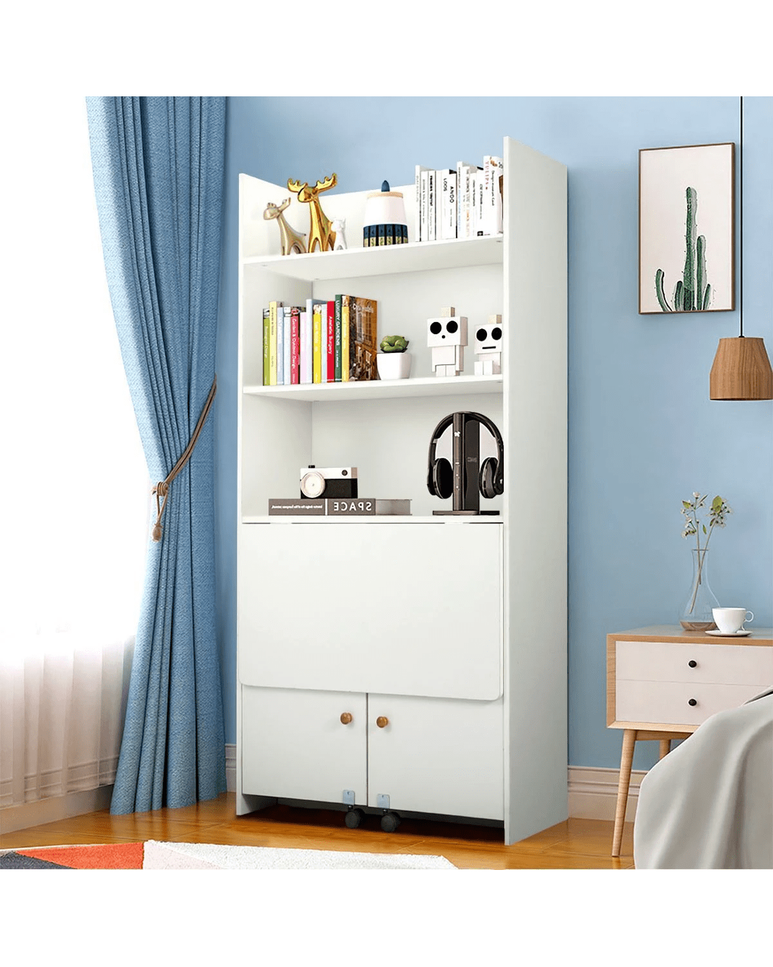 - Opening the two cupboard doors can become a desk, and there are two bookshelves under the desk