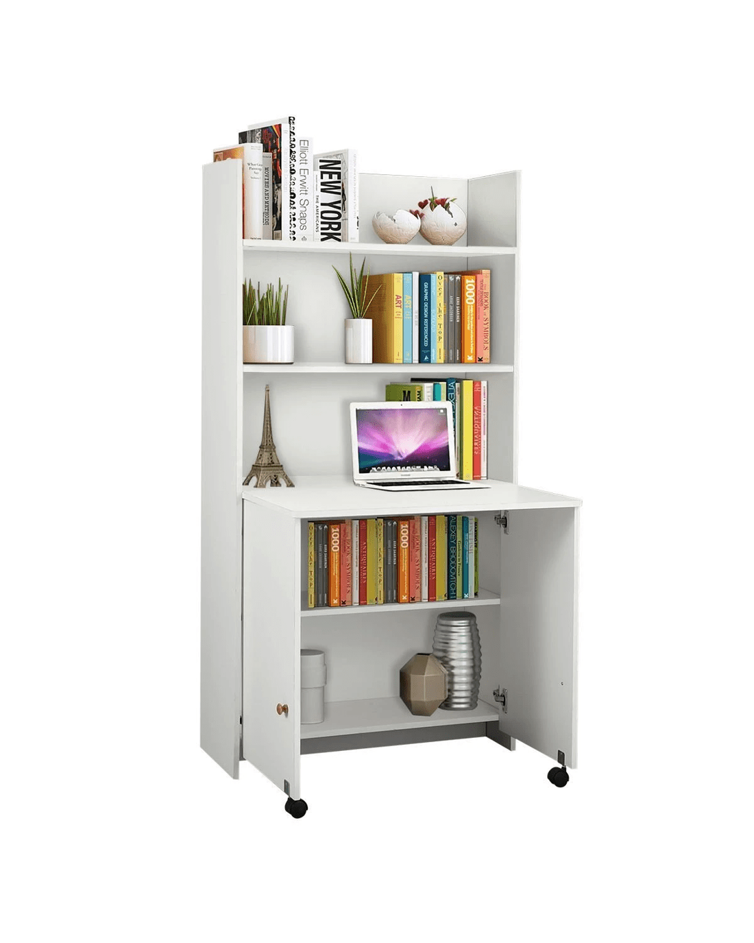 - The bookshelf is integrated with the desk, under which there are 2 wheels