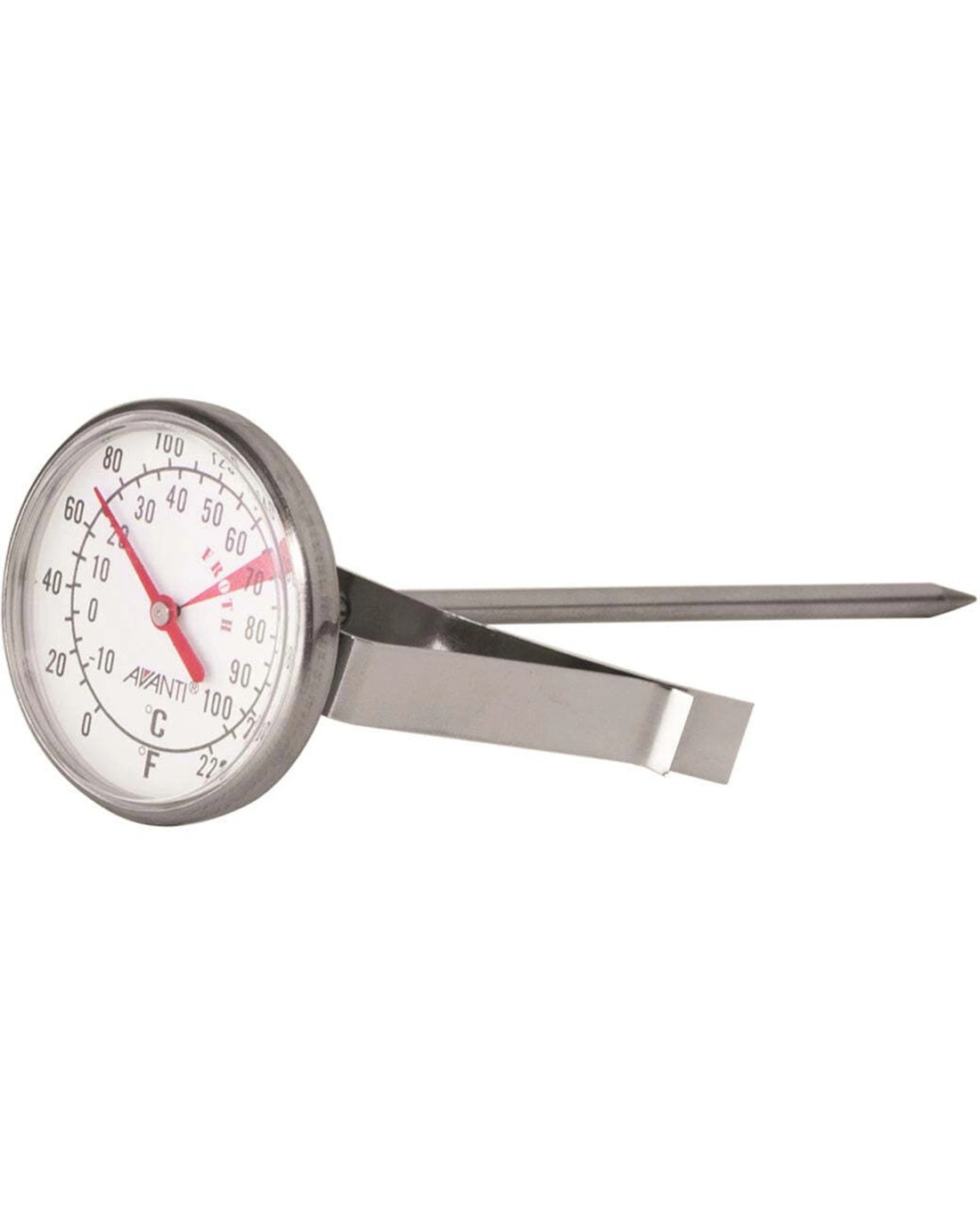 The Avanti Stainless Steel 4.4cm Frothing Milk Thermometer is designed for precise temperature measurement when frothing milk. Its large 44mm diameter dial ensures easy visibility and accurate readings, making it suitable for both home and professional use.This durable thermometer features both Celsius and Fahrenheit displays, with the temperature dial marked with a red indicator at the optimal temperature for frothing milk. Made from stainless steel, the probe and body are easy to clean and resistant to corrosion. The thermometer includes a frothing pitcher clip for convenient storage and quick access during milk preparation.Key FeaturesLarge Dial for Clear Readings - The 44mm diameter dial provides easy-to-read temperature measurements, ensuring precise milk frothing.Dual Temperature Scales - Displays in both Celsius and Fahrenheit for versatile use across regions and personal preferences.Frothing Temperature Indicator - Marked with a red pointer at the ideal temperature for frothing milk, simplifying the process.Stainless Steel Durability - Made with stainless steel body and probe for longevity and easy cleaning.Frothing Pitcher Clip - Comes with a clip to securely attach the thermometer to your frothing pitcher for quick and efficient use.SpecificationsBrand: AVANTIProduct Type: Kitchen thermometerDisplay: Celsius and FahrenheitTemperature Range: -10C to 100CDiameter: 44mmIncluded: Frothing pitcher clip