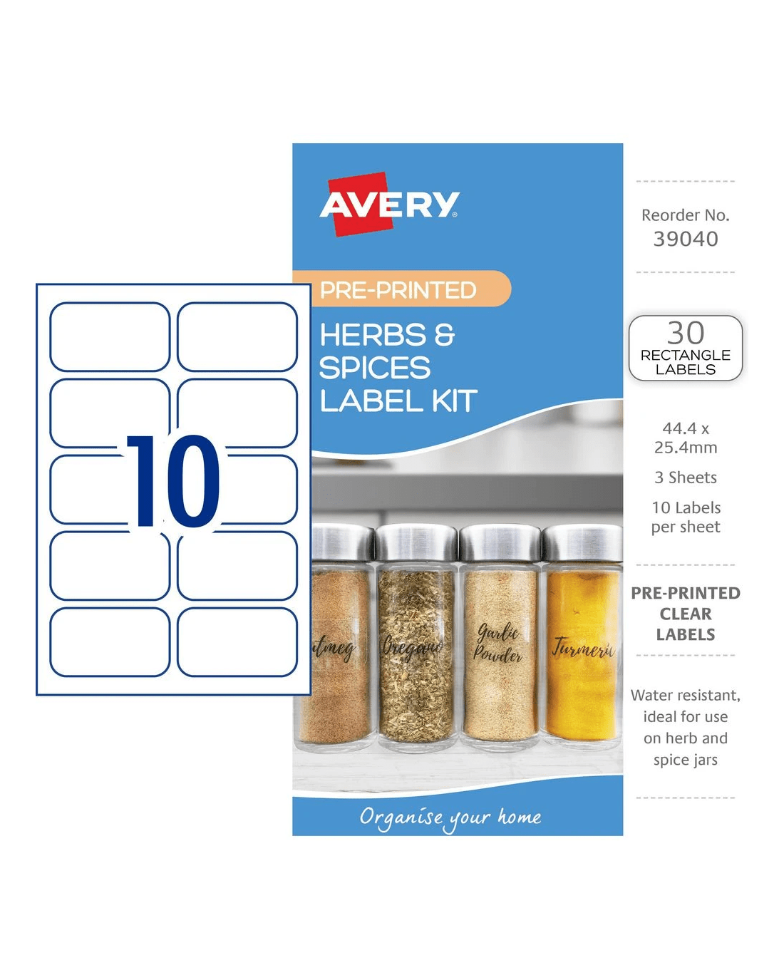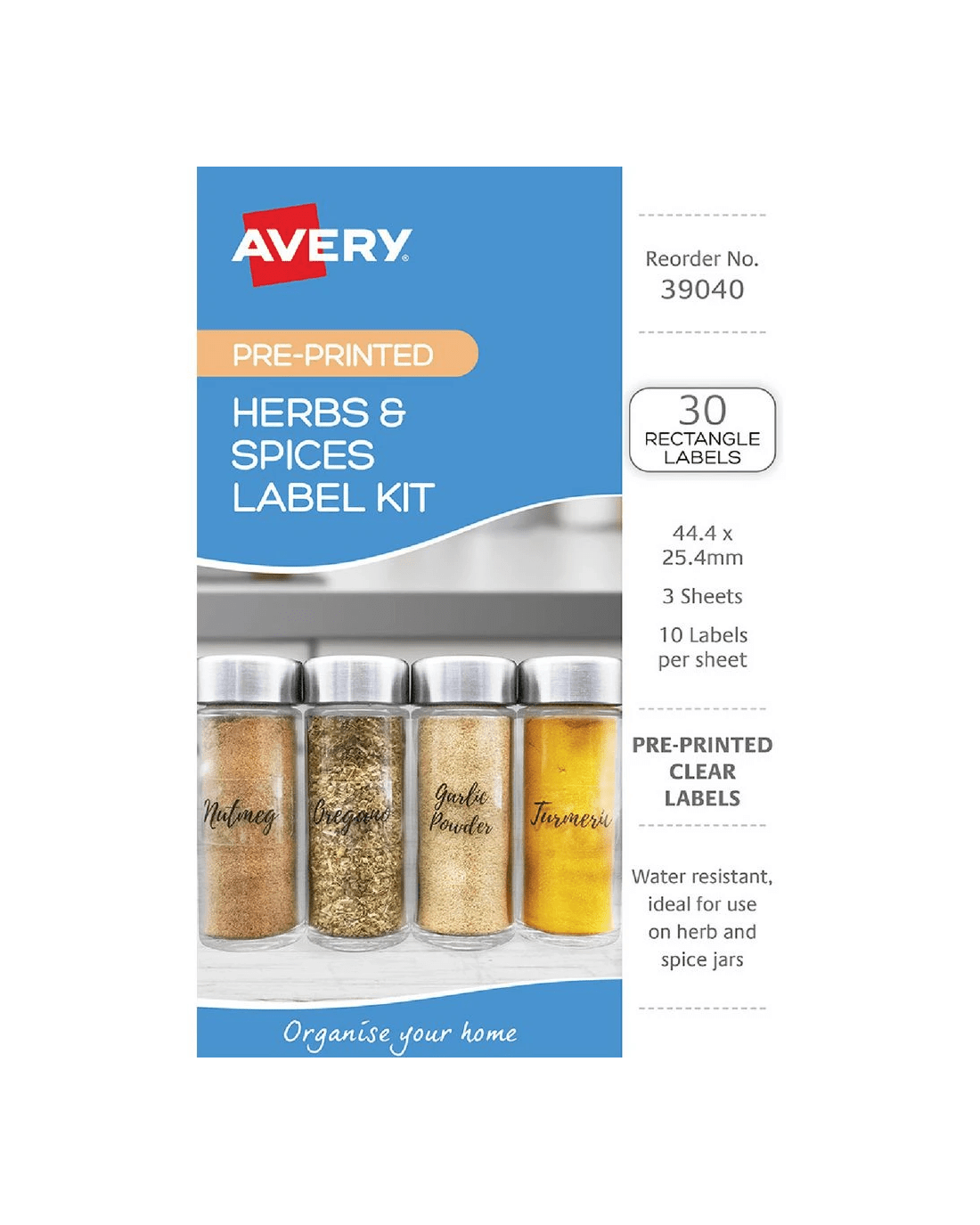 This Avery Herbs & Spices Starter Kit is an ideal way to organise your pantry. These clear labels with black font are pre-printed with the most popular herbs and spices and the kit also includes 4 blank labels so you can handwrite the name of any items not included in the pack. The labels stick securely and are ideal for an aesthetic look in any organised pantry.