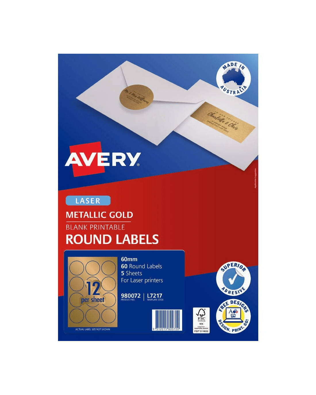 Sold by OfficeworksAvery 12UP Laser Round 60mm Labels Gold 5 Sheets