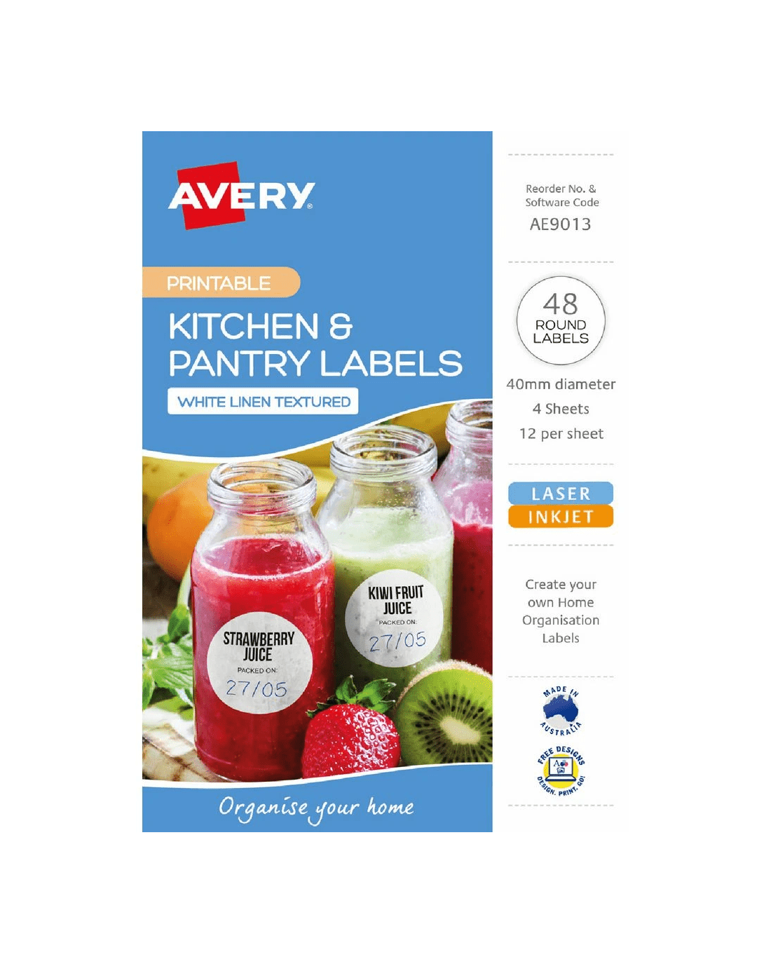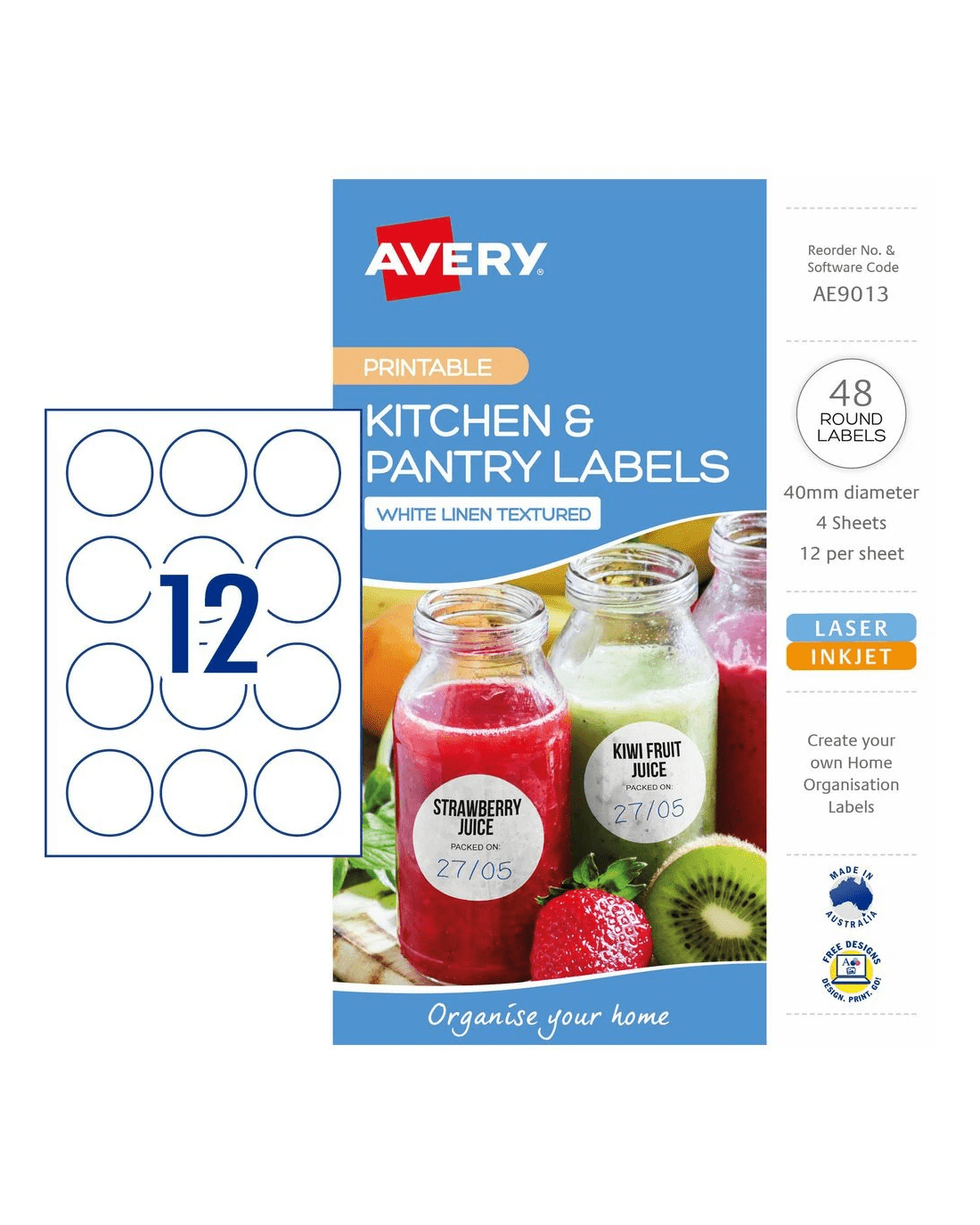 These Avery Round Labels are a great option in the kitchen and pantry for creating your own personalised home organisation solutions. They are perfect for use on jars, containers and storage boxes and are made from premium linen textured material that is water-resistant. These labels are perfect for identifying items that might be used with water and the permanent adhesive sticks to a multitude of surfaces such as glass, plastic and paper.
