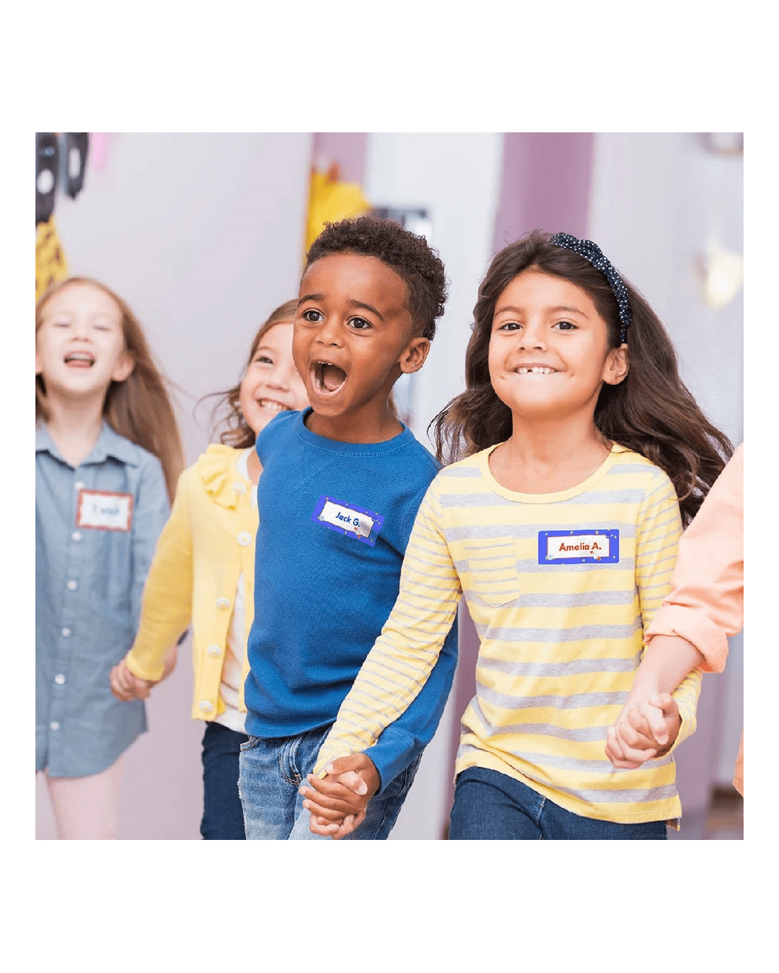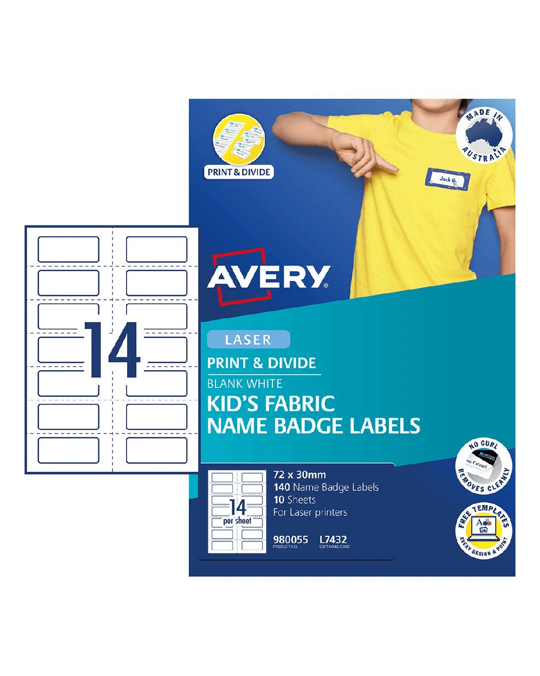 Make school events and children's parties more comfortable with these adhesive kids fabric name badge labels from Avery. They feature a unique flexible white silk acetate fabric material which moves freely with your clothing and sticks securely without curling or falling off. Plus, they are safe for applying to all fabrics and can be removed easily without leaving residue.