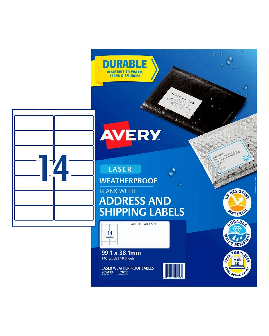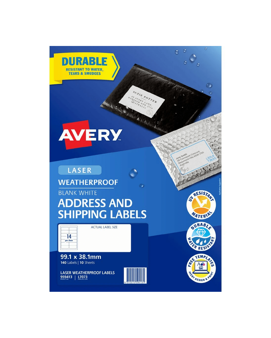 These Avery Weatherproof Labels are a durable choice for shipping labels and barcodes. You can easily print your own designs and text onto the labels using a laser printer as they come on an A4 sized sheet.