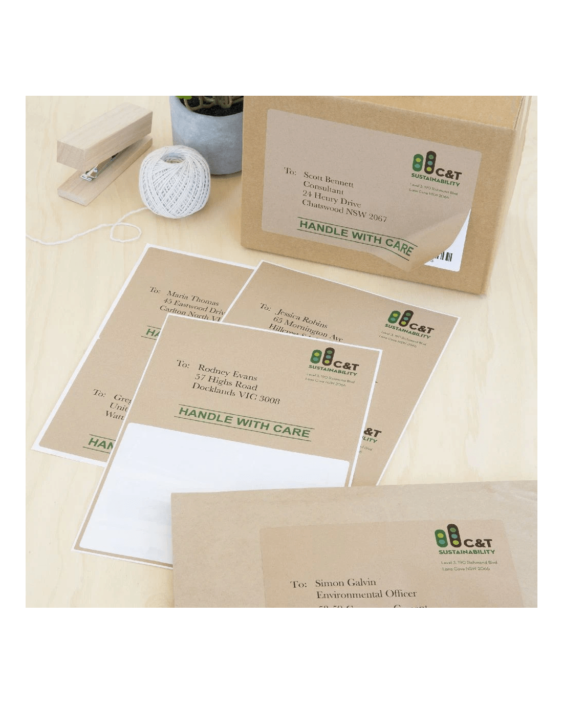 - Each label has a kraft design.
