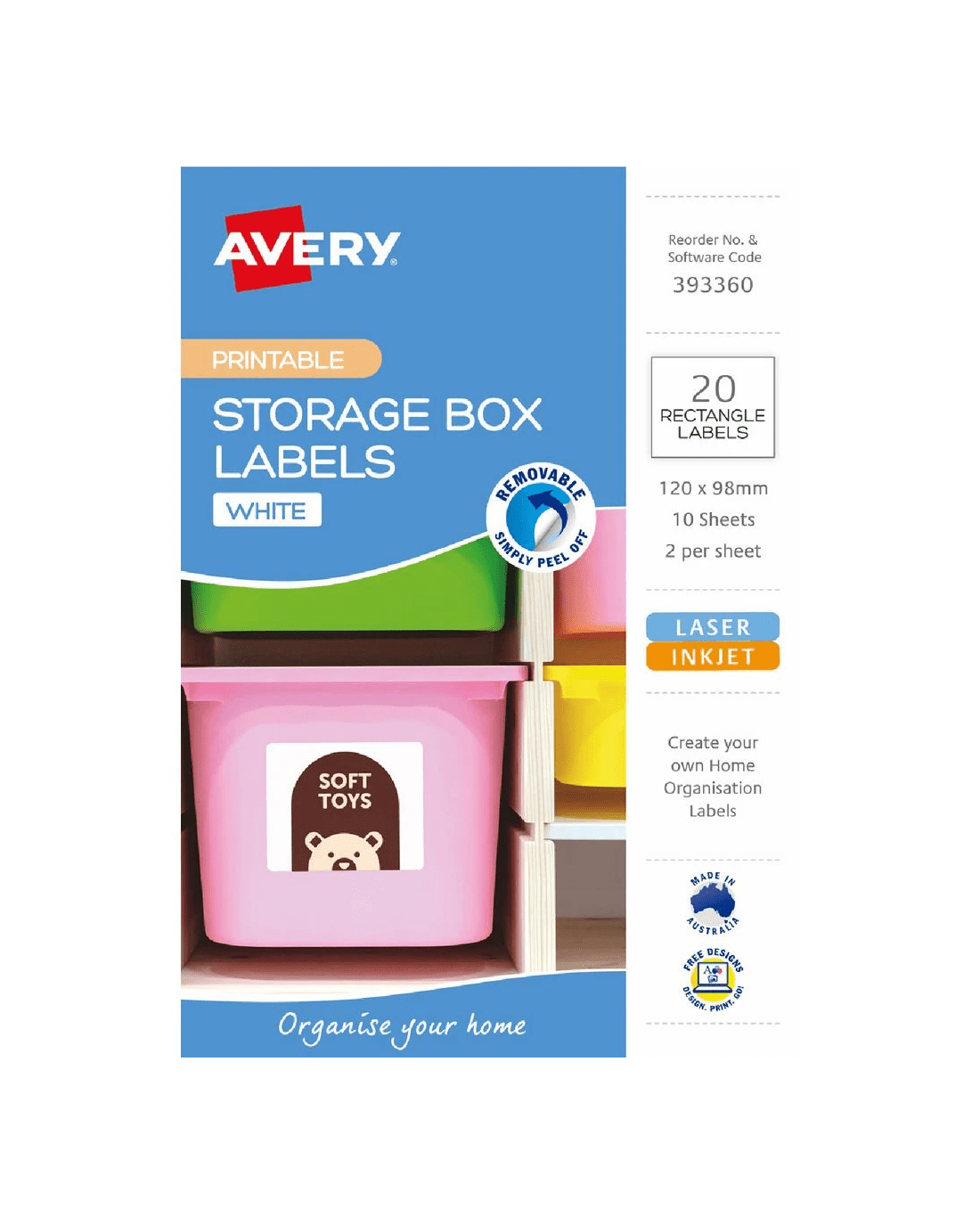 These Avery Laser Removable Storage Labels are a great way to identify the content of storage containers and boxes that are constantly being reused and changed. Avery printable storage box Labels are a great option for storage tubs, food containers, toy bins, or containers. Available in A5 packs, these rectangle labels have removable adhesive that allows them to stick to multiple surfaces and removes cleanly.