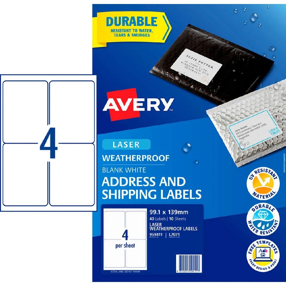 Avery 4UP Laser Weatherproof Shipping Labels White 10 Sheets