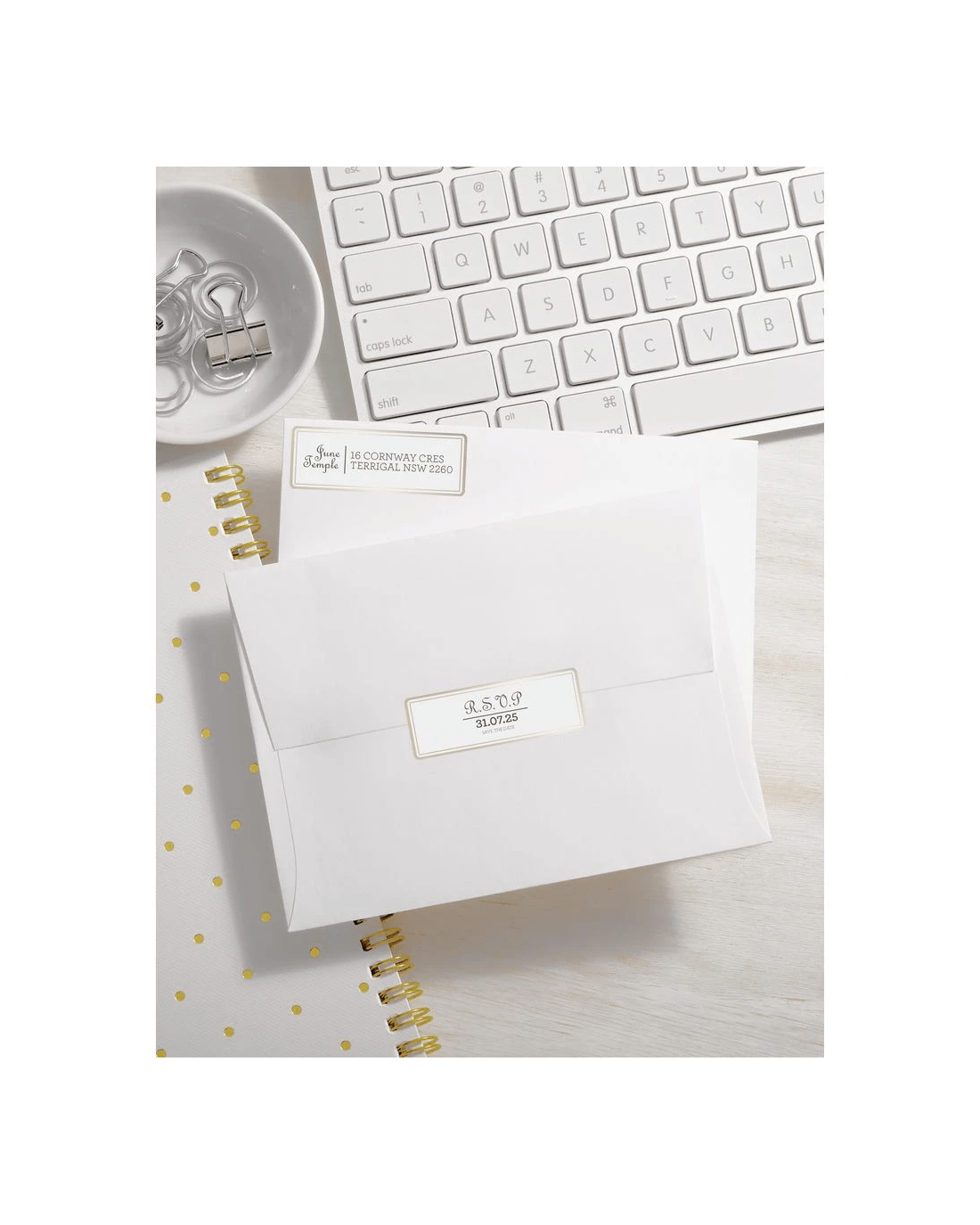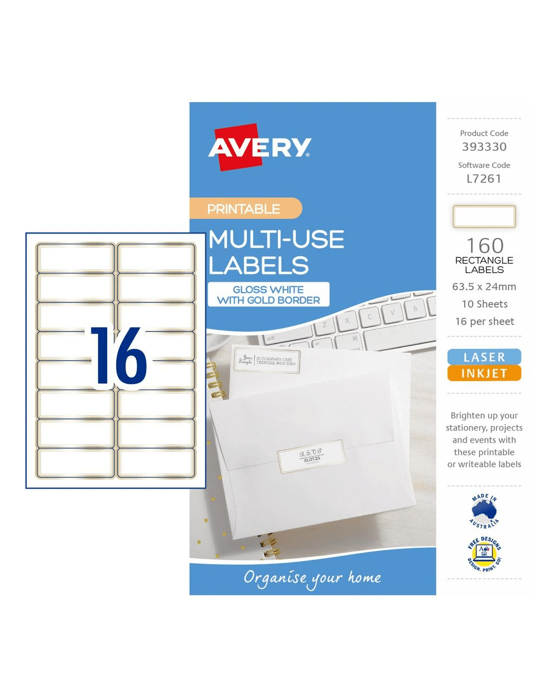 These Avery Laser White Gloss Labels are a great way to brighten up your stationery, products and events. The pre-printed gold border adds an extra design element for a professional look and feel, and they stick securely and are easy to apply. Available in an A5 pack, these rectangular labels can be hand written or printed using a selection of organisation templates via Avery Design & Print online.