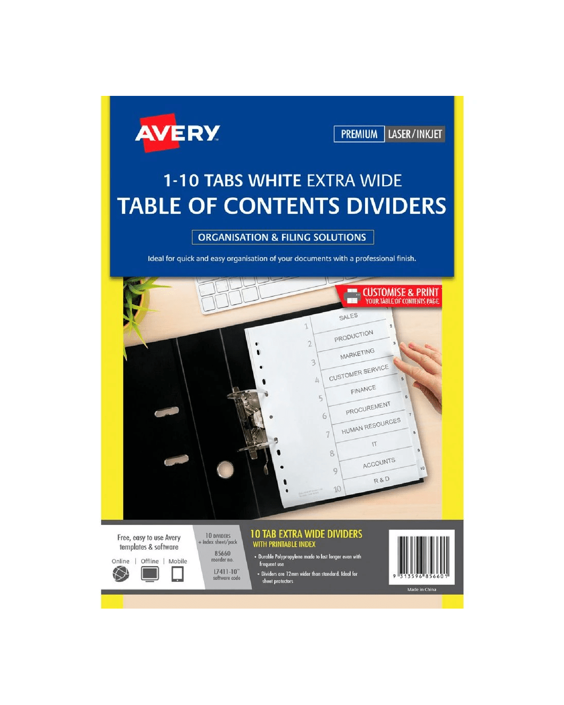 These Avery A4 Extra Wide Polypropylene Divider 1-10 Tabs are great for binders that are used regularly as the strong polypropylene material will not break or tear with constant use. The 1-5 tabs allow you to easy access the documents and files inside your binder. These tabs comes with a contents sheet that you can print on to alert the reader of where to look for their documents.