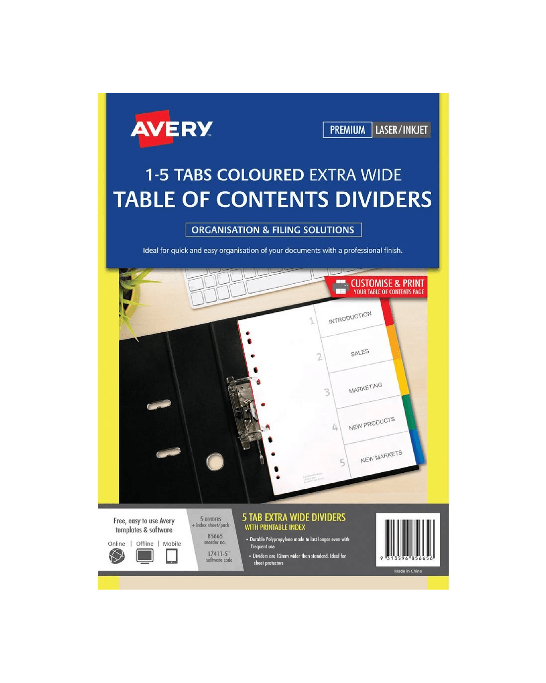 Avery Extra Wide Tab Dividers are perfect for use in your binder or file to separate and organise your documents. The binders have an extra wide design so you can use them with sheet protectors.