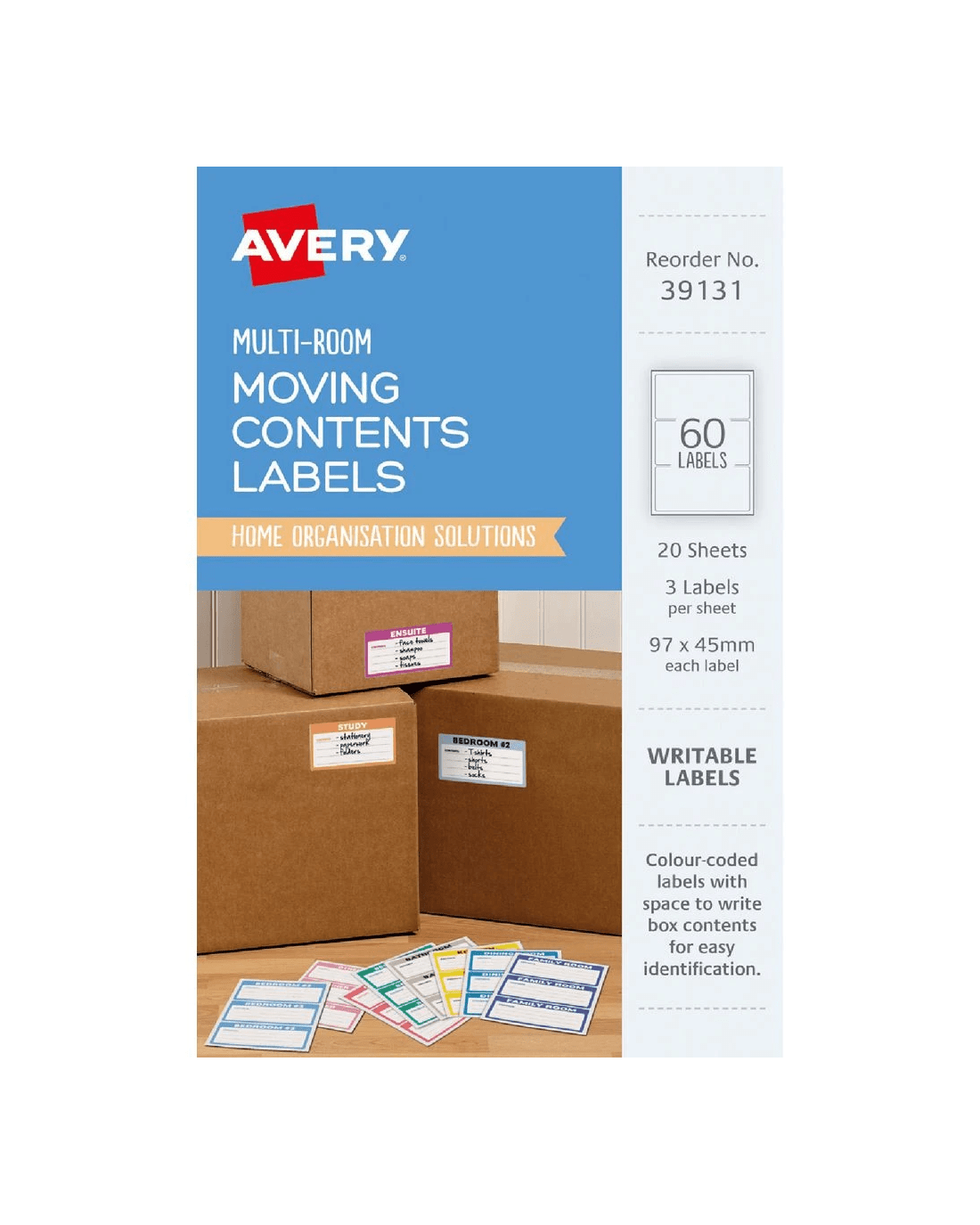 The Avery Moving Contents Labels are ideal for identifying what's in your boxes when you're moving to a new house or office. You can simply handwrite the contents of the box onto the label for easy identfication, with colour coding for organisational purposes. The labels also have pre-printed categories such as family living room, bedroom and bathroom so you can sort out your storage boxes room by room.