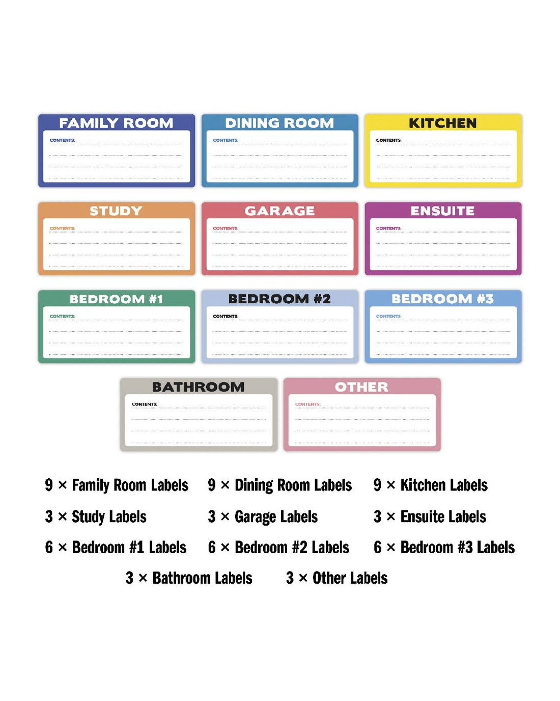 - The labels have colour coding and room categories to help organise your storage.