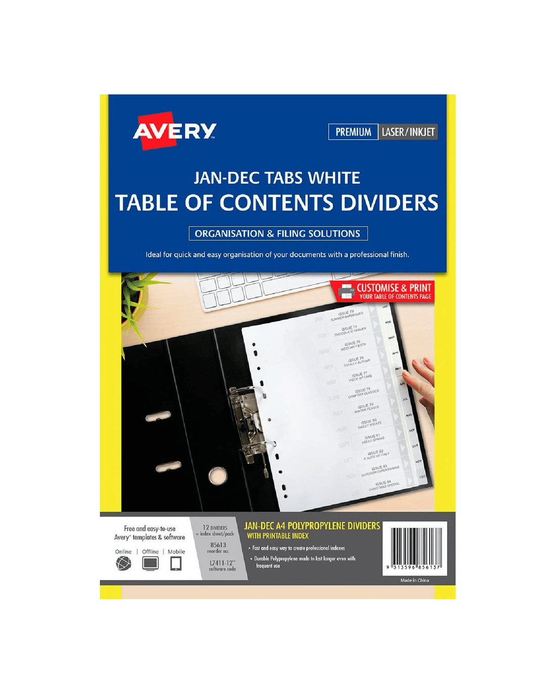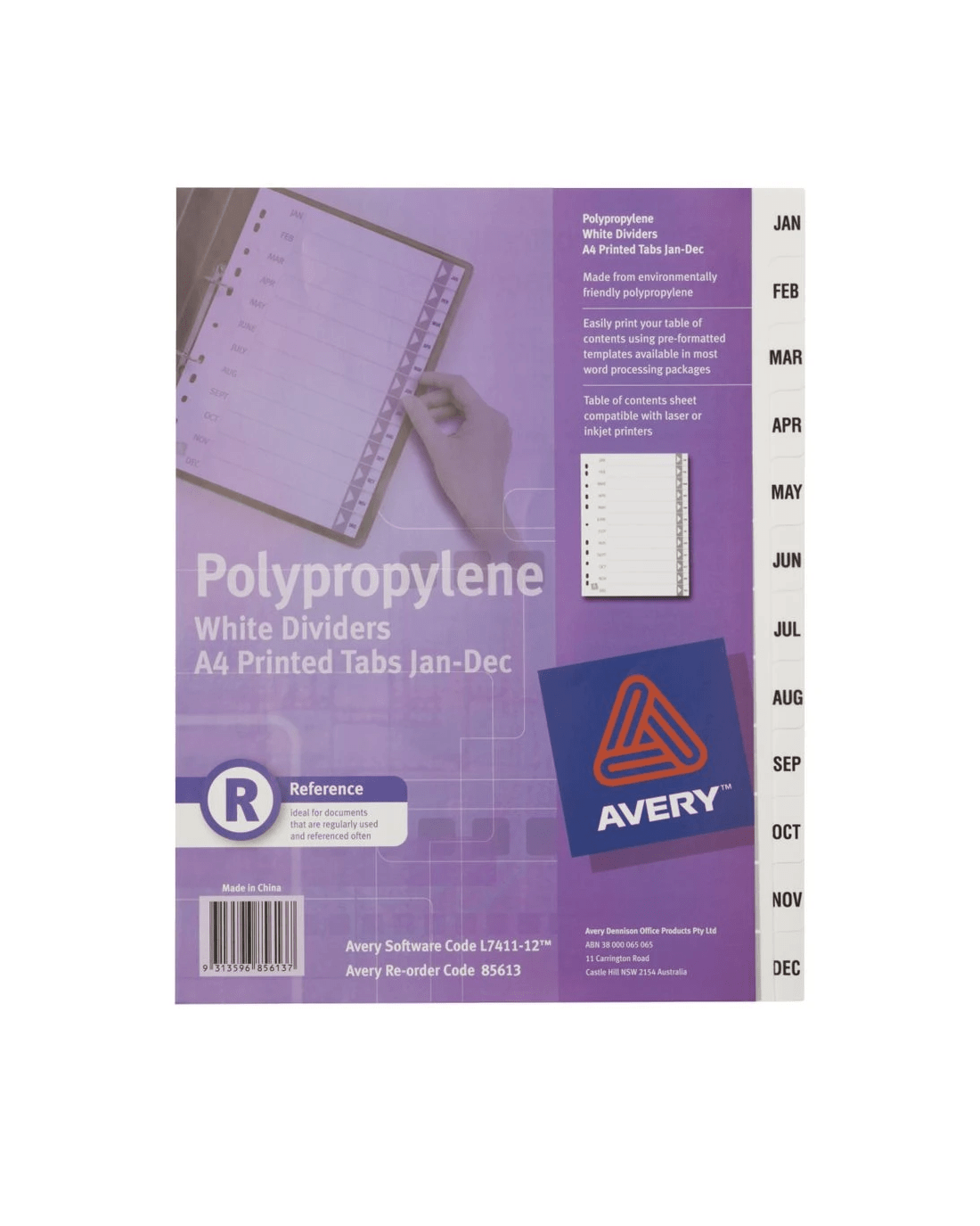 These Avery Polypropylene A4 Printed Tab Dividers will allow you to print your own table of contents, to organise your documents and files. They are made from durable polypropylene so you can be confident that they will last and withstand frequent use. These dividers are printed with the months from January to December.