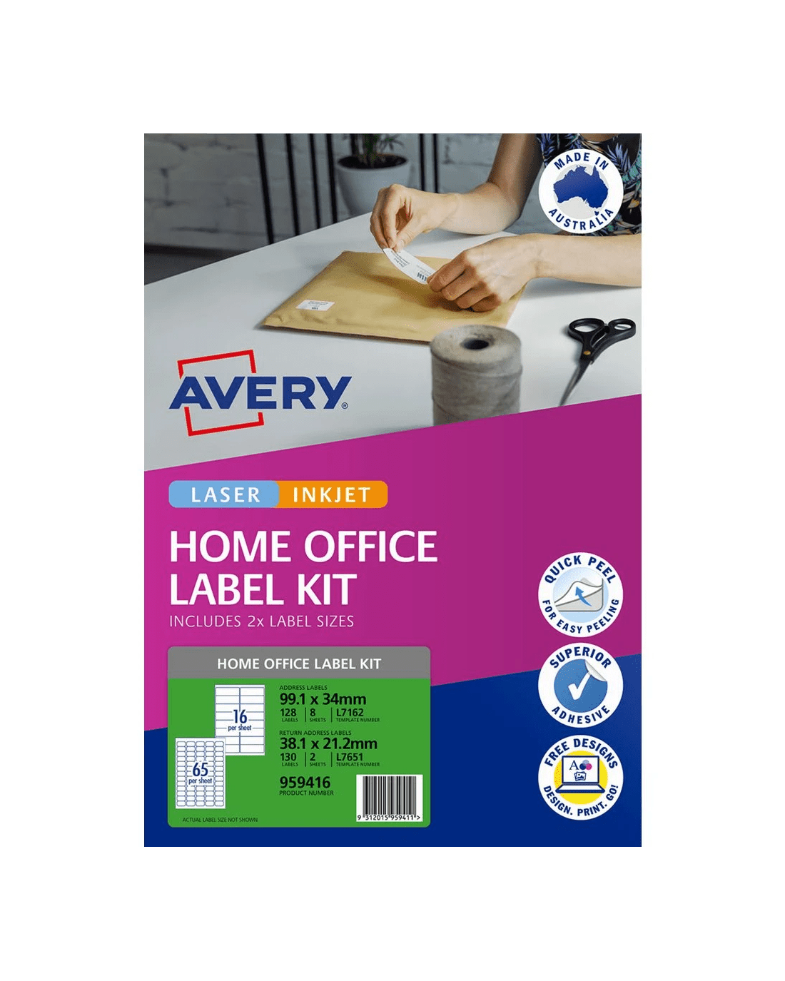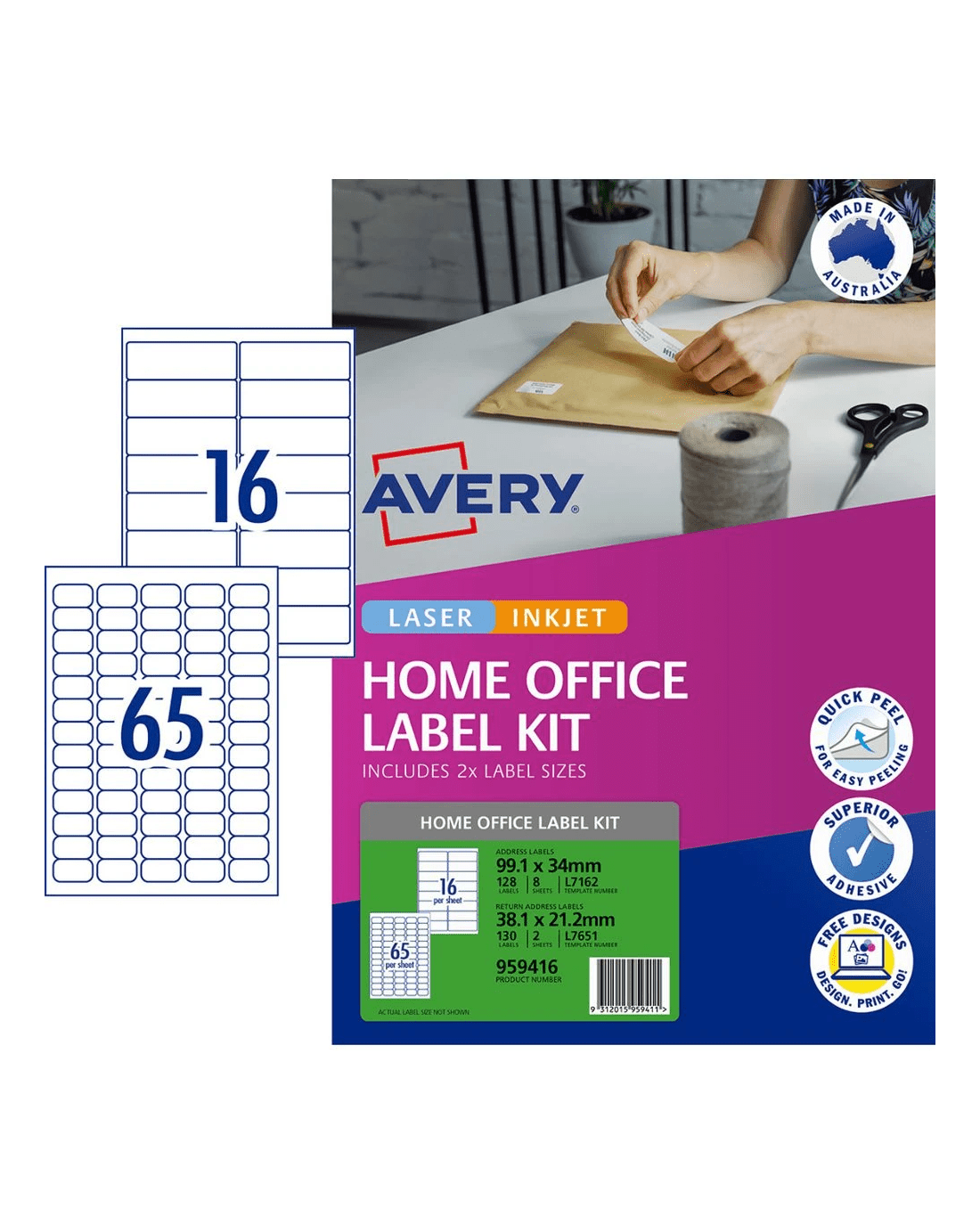 The Avery Home Office Label Kit includes 2 label sizes of premium matt white address labels and return address labels with AveryEco™, perfect for stocking up your home office. These trusty Avery white rectangular labels are also more than just a mailing solution. Available in a wide variety of sizes, they are increasingly being used to help organise and clearly identify all manner of items in the office, in schools, hospitals, small businesses and around the home.