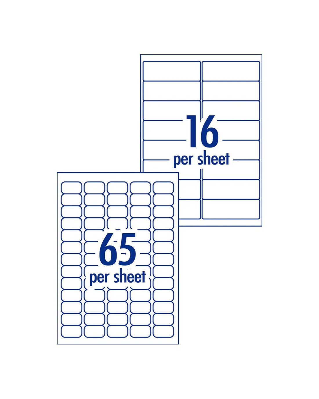 - This Home Office Label Kit comes with 2 label sizes - 128 blank matt white address labels in a pack of 16 labels per sheet in a size of 99.1 x 34mm and 8 sheets per pack, and 130 blank matt white return address labels in a pack of 65 labels per sheet in a size of 38.1 x 21.2mm and 2 sheets per pack..