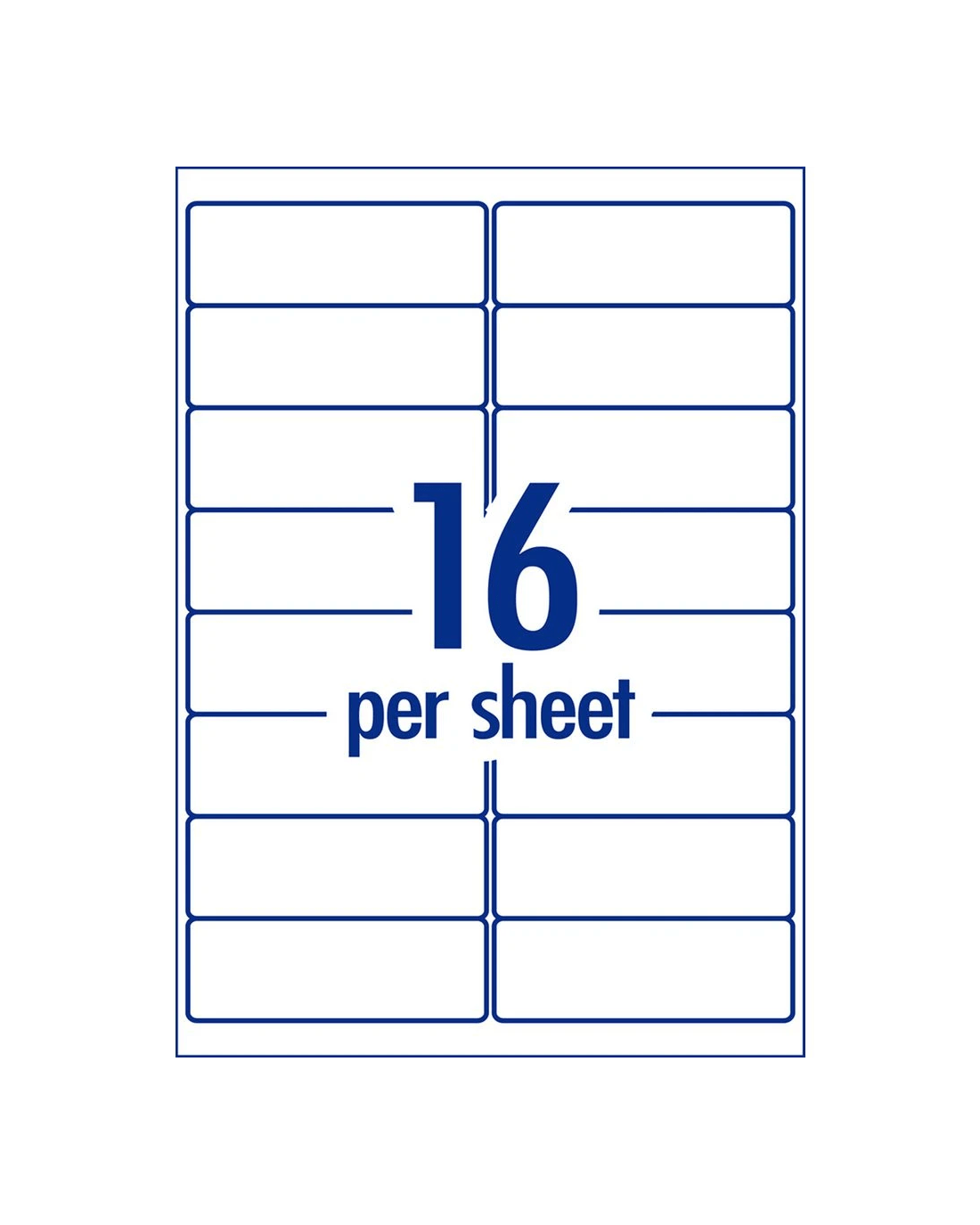 - There are 800 blank matt white labels in a pack of 16 labels per sheet in a size of 99.1 x 34mm and 16 sheets per pack.