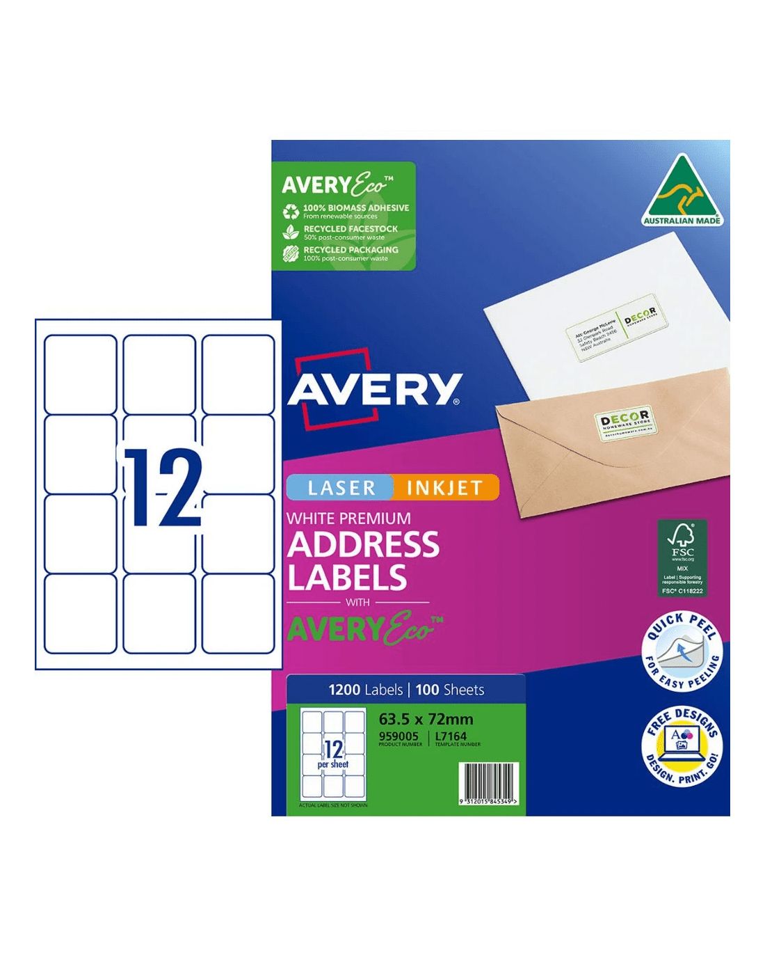 Sold by OfficeworksAvery Premium Whte Address Labels AveryEco 12UP 100sh 64x72mm