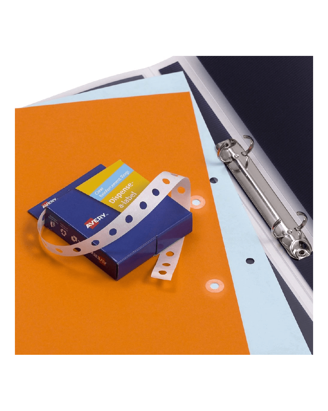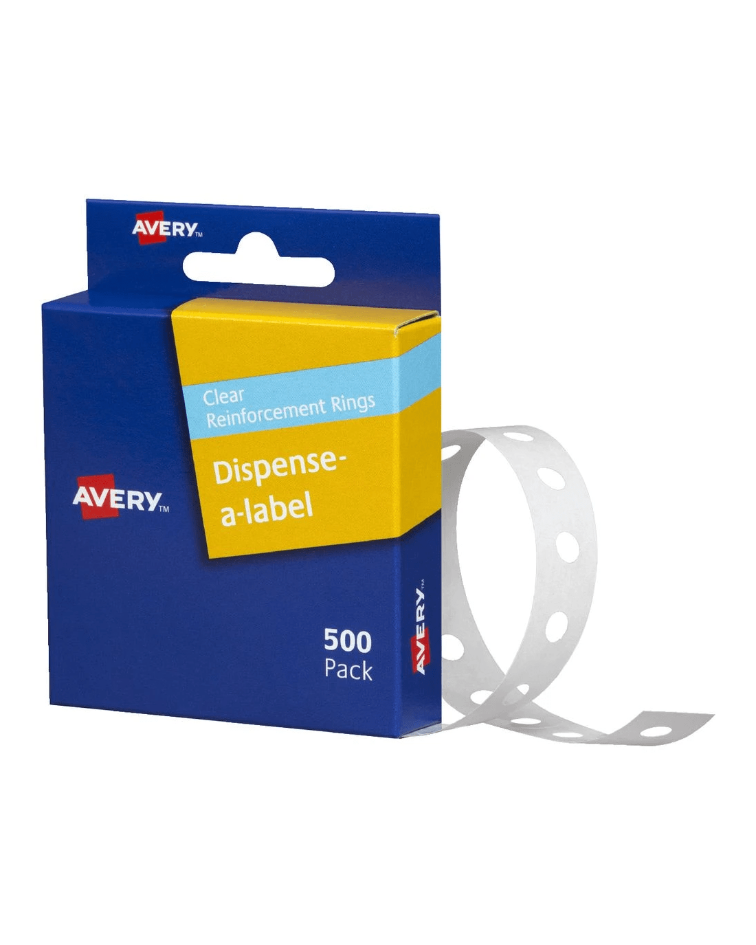 Attach these clear vinyl Avery Reinforcement Rings to strengthen and repair damaged holes. The labels come packaged in a handy dispenser that peels each self-adhesive reinforcement off the roll one by one. Apply these reinforcements to standard sized punched holes to provide a durable border that resists tearing.