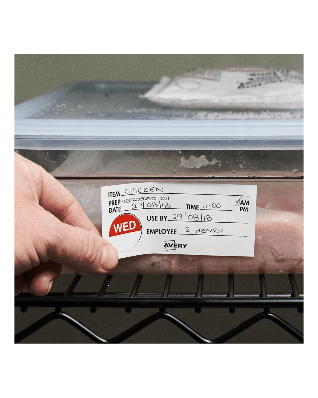 These Avery Labels are perfect to help maintain a best practice rotation of foods. These day labels provide a space to write the use by or best before date, and feature removeable adhesive that makes them easy to stick wherever they’re needed.