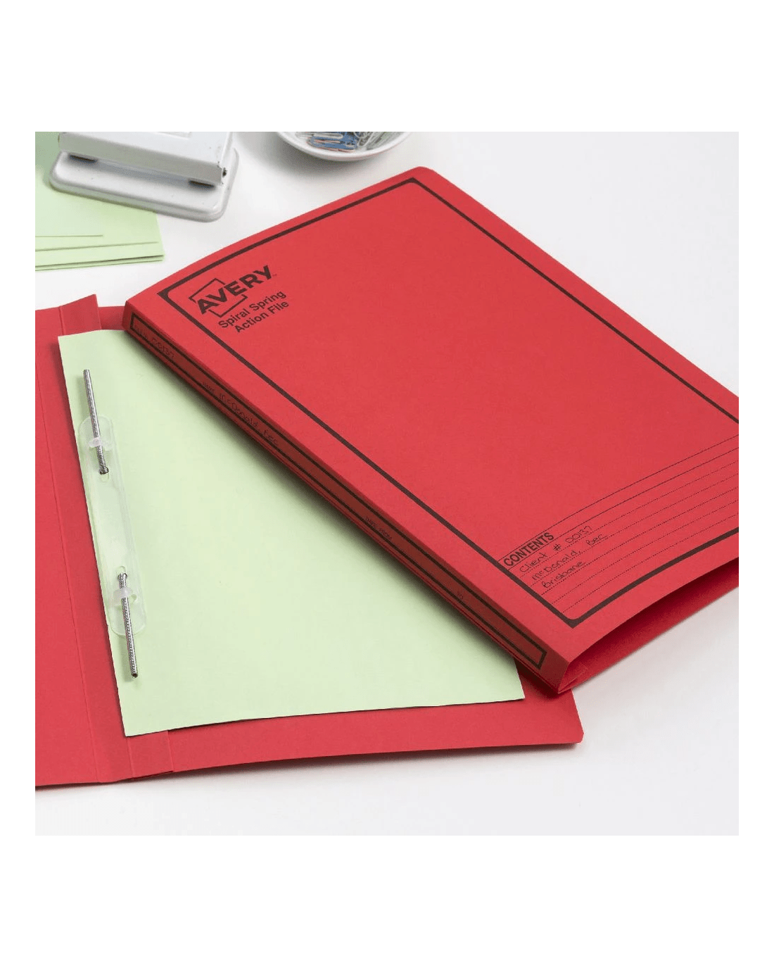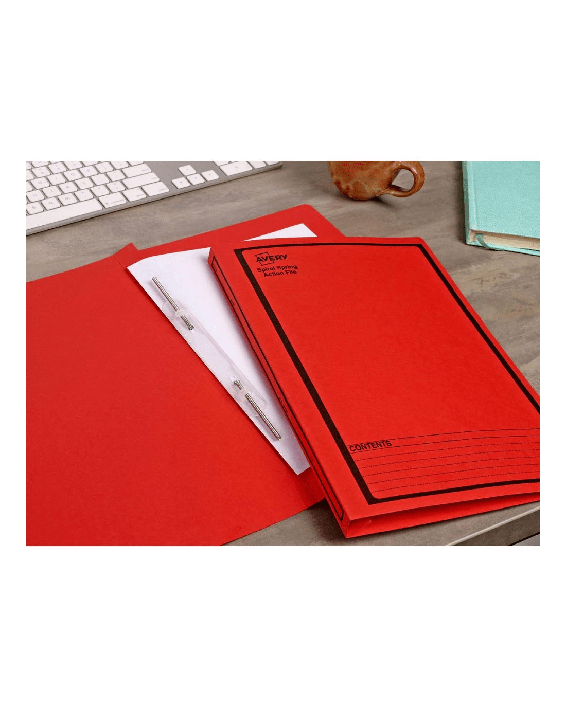 Avery Spiral Spring Action Files are made out of heavy weight board to ensure that your documents are well protected. The built-in spiral spring coil fastener securely holds papers up to foolscap size and ensures that your files are held in place while you're out and about.