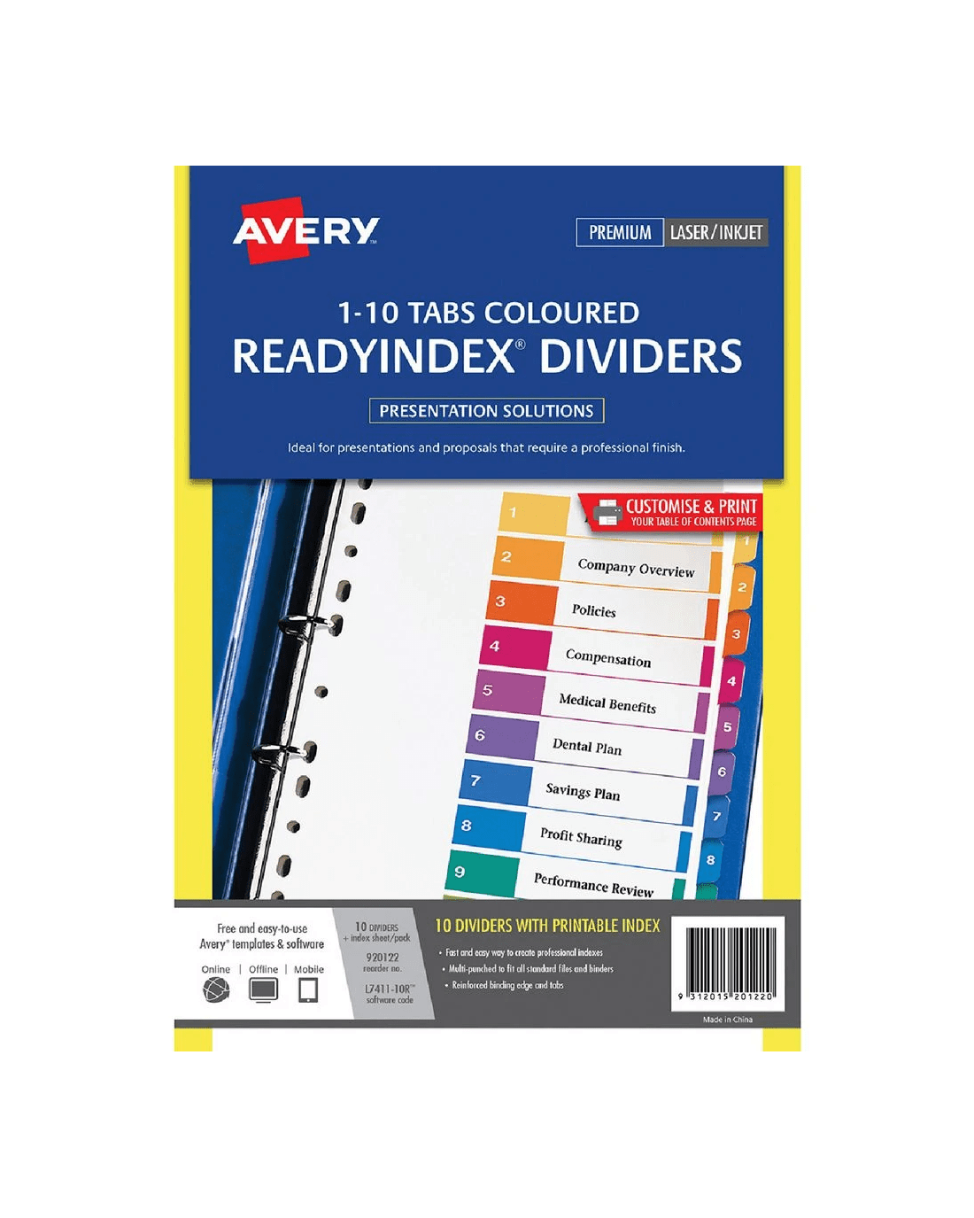 This Avery Divider features a table of contents that can be flipped for use in either portrait or landscape mode, depending on how your folder is used. It's compatible for use with laser and inkjet printers allowing you to customise the design and comes with strong plastic tab reinforcement.