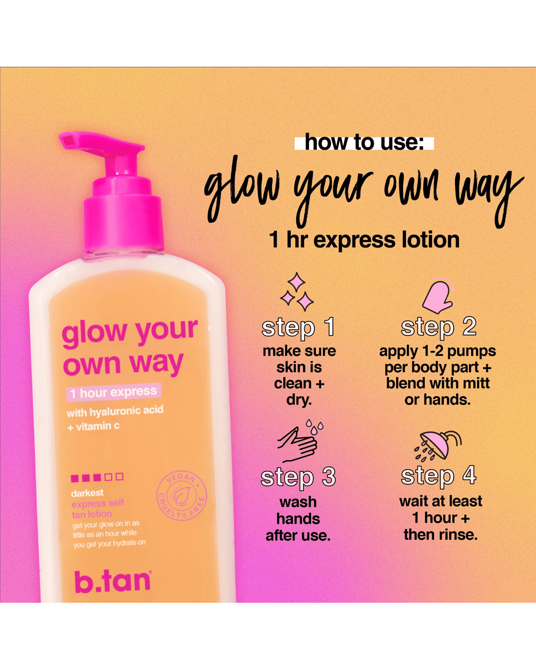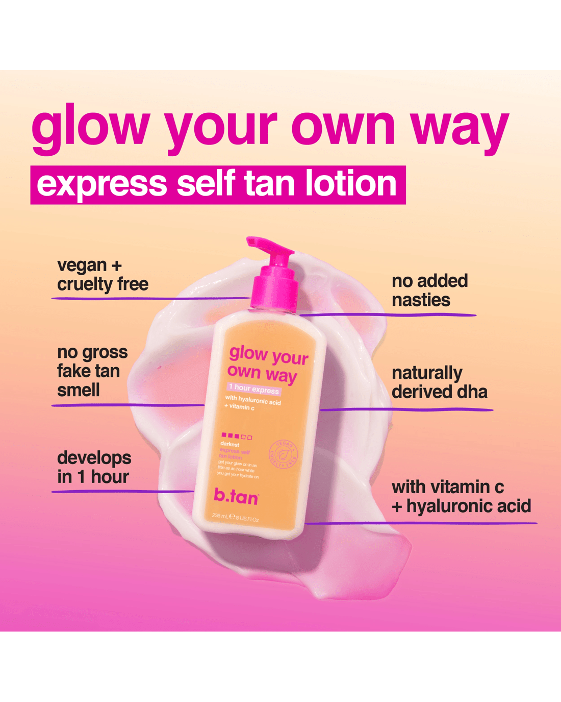 Sold by Kmartb.tan Glow Your Own Way 1 Hour Express Self Tan Lotion - Hyaluronic Acid and Pro-Vitamin B5