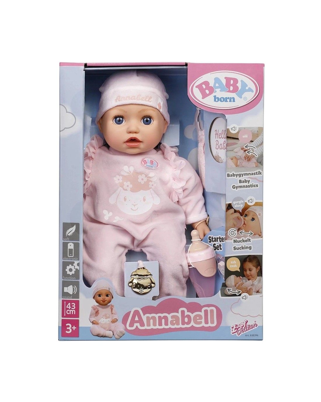 Annabell responds to touch and interactions with sweet movements and sounds. When she is fed with her bottle or sucks on her pacifier, she moves her mouth and eyes - almost like a real baby. After eating, she needs a little break: If you gently pat her back, she makes a burp. When she gets tired, she can be gently rocked to sleep in two directions. With baby gymnastics, the play experience becomes more active: Annabell makes cute baby sounds when her arms and legs are moved. If you tickle Annabell's belly, she reacts with funny giggles - and if it gets too much, there's even a little baby fart! Annabell also has everything with her that is needed for loving care: bottles, pacifiers, a comforter, a medallion as well as a baby passport and sticker sheet as well as her cute outfit with romper and hat form an extensive doll starter set. Everything from BABY born in size 43cm fits her. Ages 3 +