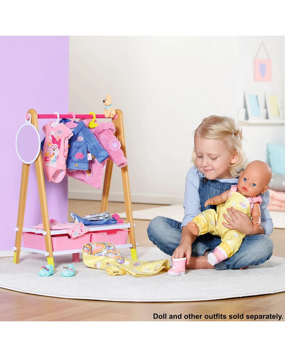 With the BABY born Deluxe Rain Outfit, even the rainiest day turns into a fun outdoor adventure. Lovingly designed, this set is the perfect gear for 43 cm dolls to brave the elements through imaginative play. The outfit includes a cheerful yellow raincoat paired with matching rain pants. Coordinated in colour and style, these pieces lift spirits with their bright and happy look. Completing the ensemble are soft pink rubber boots — not only adorable but perfect for keeping little doll feet dry on "wet" playroom floors. Thanks to the child-friendly design, the outfit is easy to put on and take off. Even small hands can dress their doll independently, helping their favourite companion get ready for rainy weather. This supports fine motor skills and builds confidence through self-directed play. Whether jumping in pretend puddles, going on make-believe rainy day hikes through the living room, or playing outside on the patio, this set sparks creativity and adds a splash of colour to every playtime scene. The BABY born Deluxe Rain Outfit is both a practical and stylish accessory for young doll lovers who don't want to leave their favourite companion behind — no matter the weather. Ages 3 +