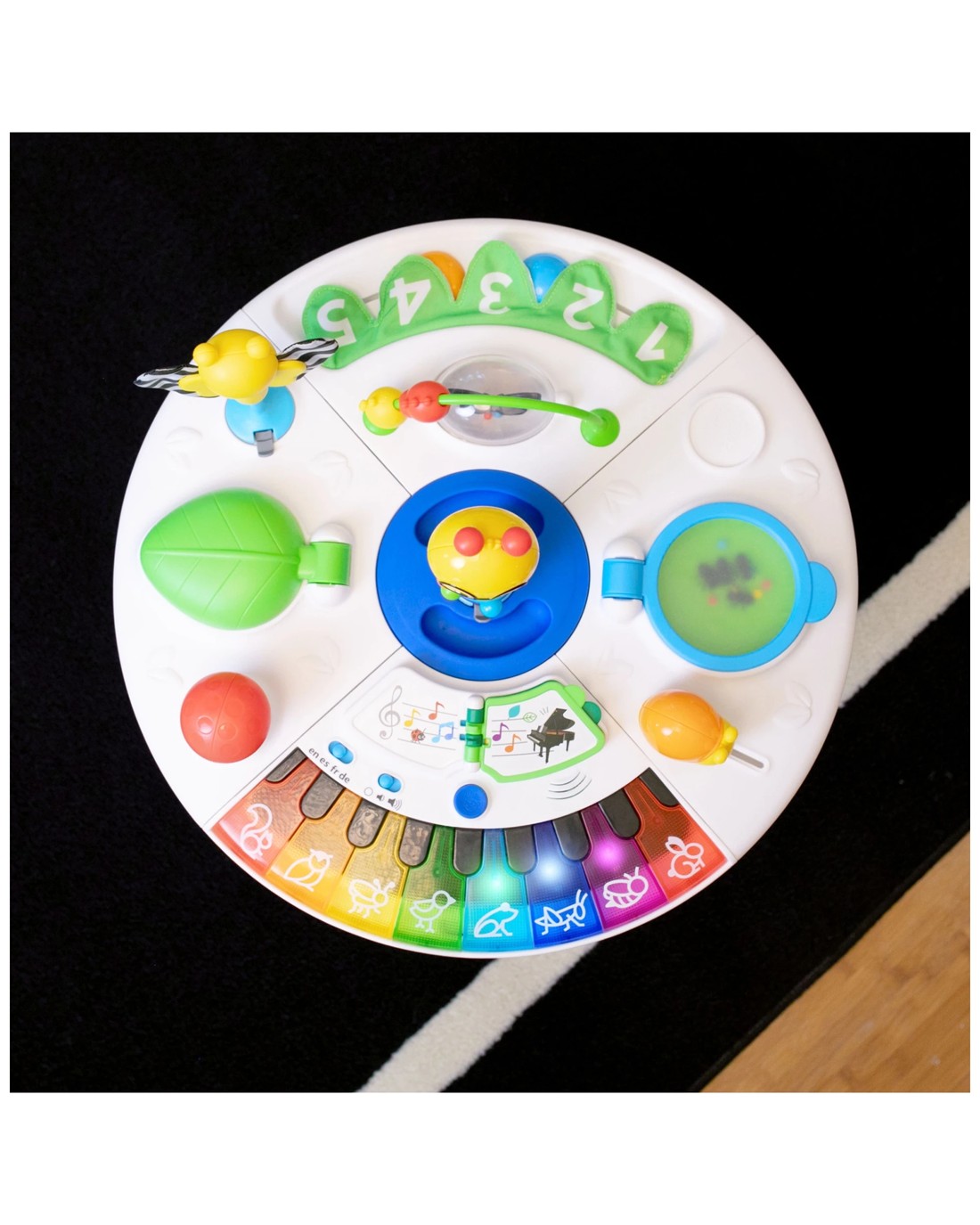 This innovative activity centre combines a walk-around discovery centre, a discovery table, an art table, and removable floor toys, providing multiple ways for your child to learn and develop at every stage. The three-position height-adjustable seat rotates 360 degrees, supporting your child's first steps and encouraging mobility. The product features fifteen nature-themed toys and a full-octave piano that introduces music, animals, and colours in English, Spanish, French, and German, fostering auditory, visual, and tactile discovery.