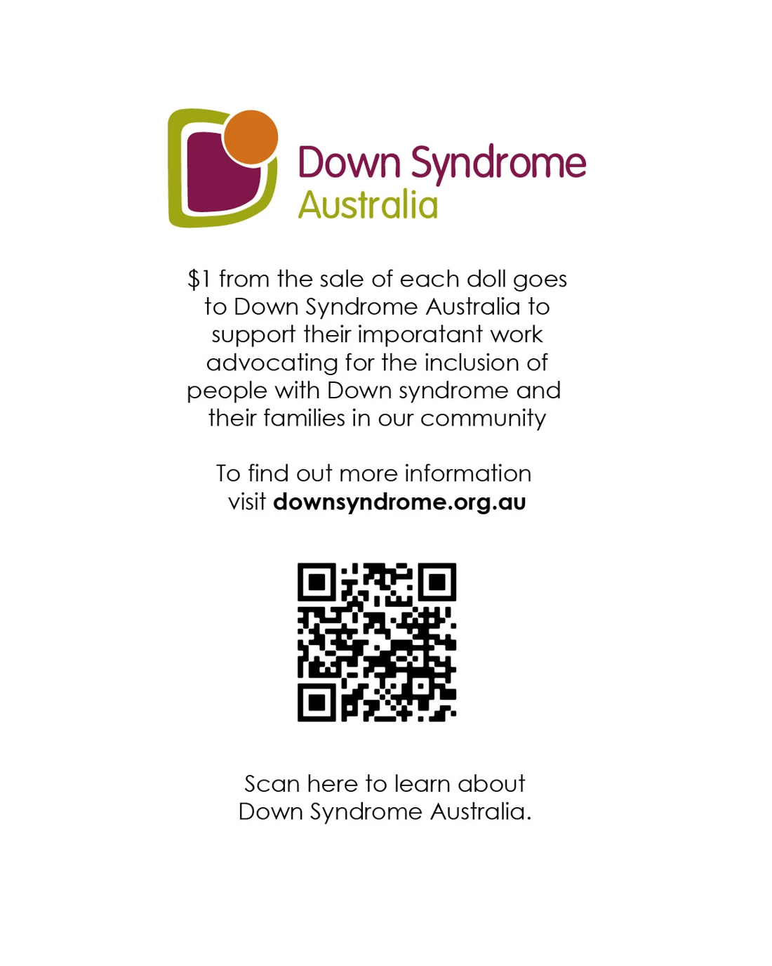 $1 from the sale of each doll goes to Down Syndrome Australia to support their important work advocating for the inclusion of people with Down syndrome and their families in our community.