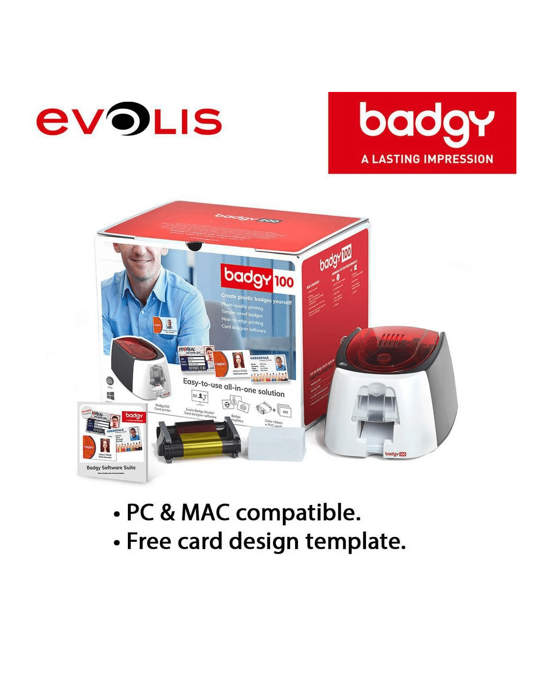 - The included Evolis Badge Studio software is compatible with both Mac and PC so that you can design you own cards.