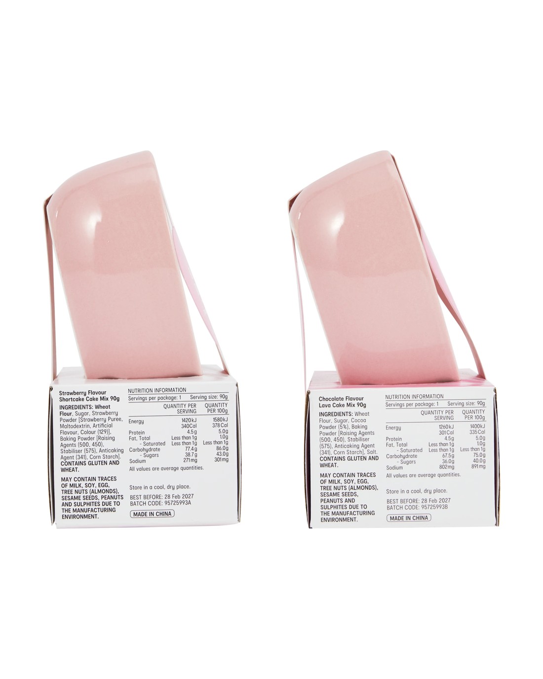 • Strawberry flavour shortcake cake mix: Wheat Flour, Sugar, Strawberry Powder [Strawberry Puree, Maltodextrin, Artificial Flavour, Colour (129)], Baking Powder [Raising Agents (500, 450), Stabiliser (575), Anticaking Agent (341), Corn Starch]